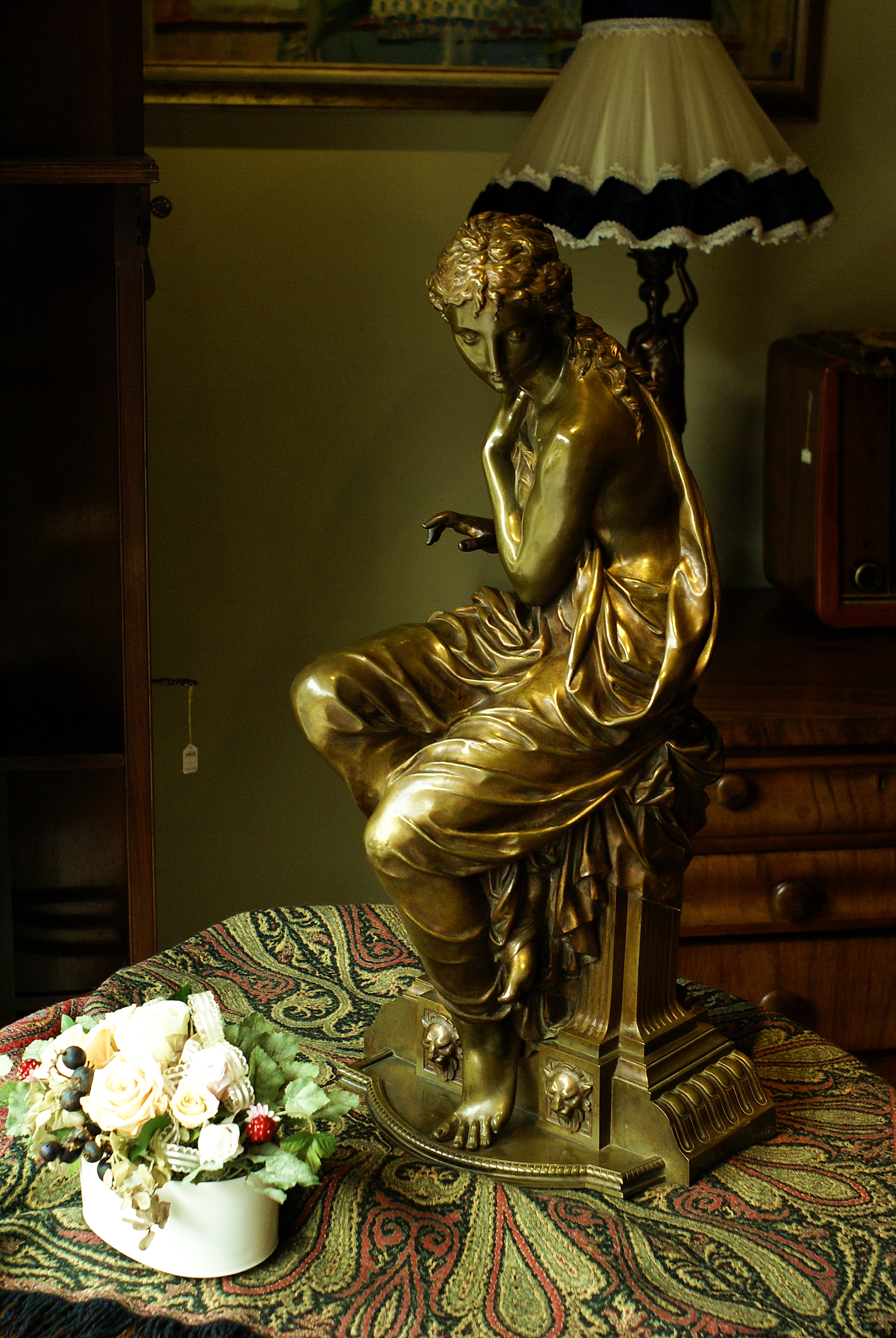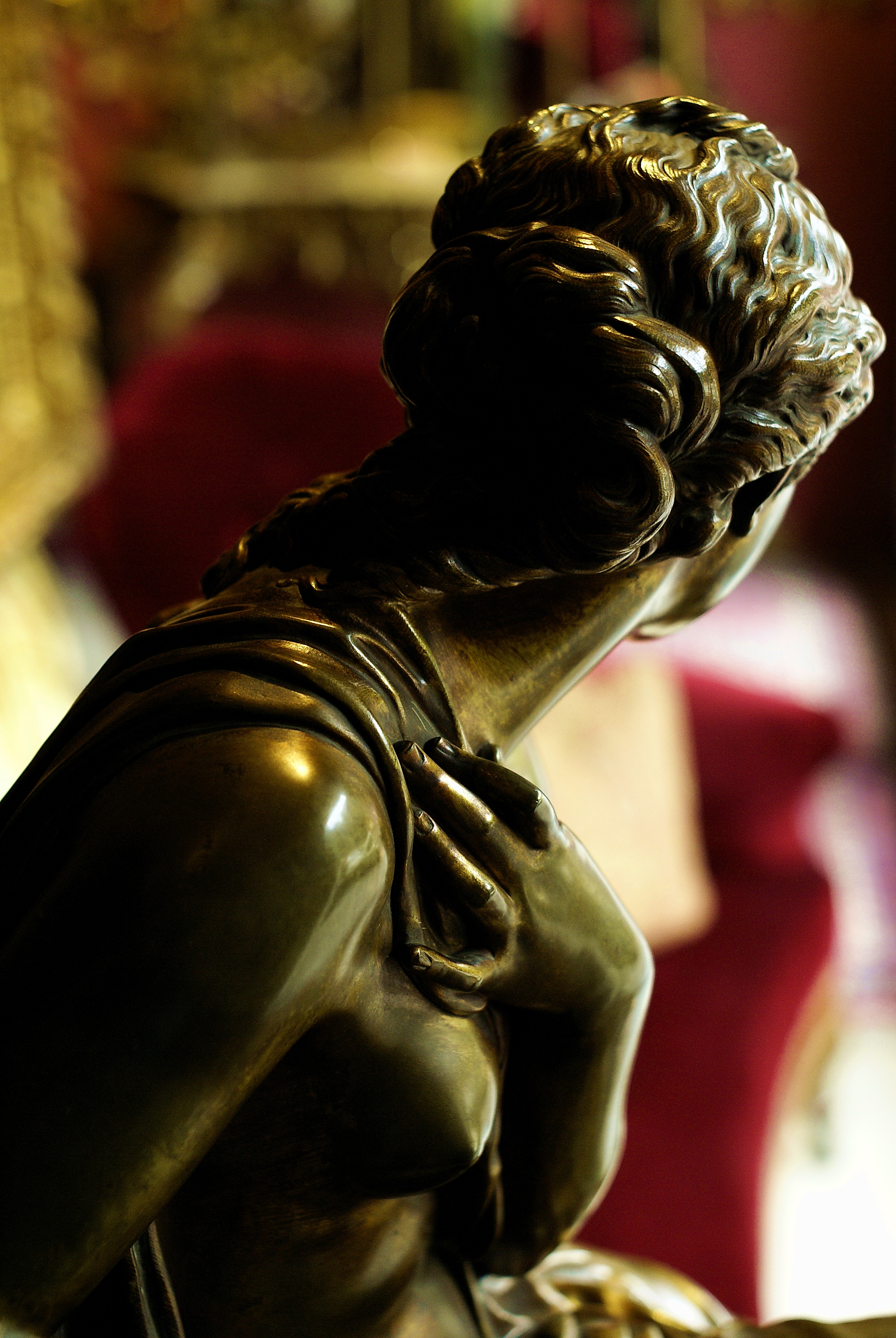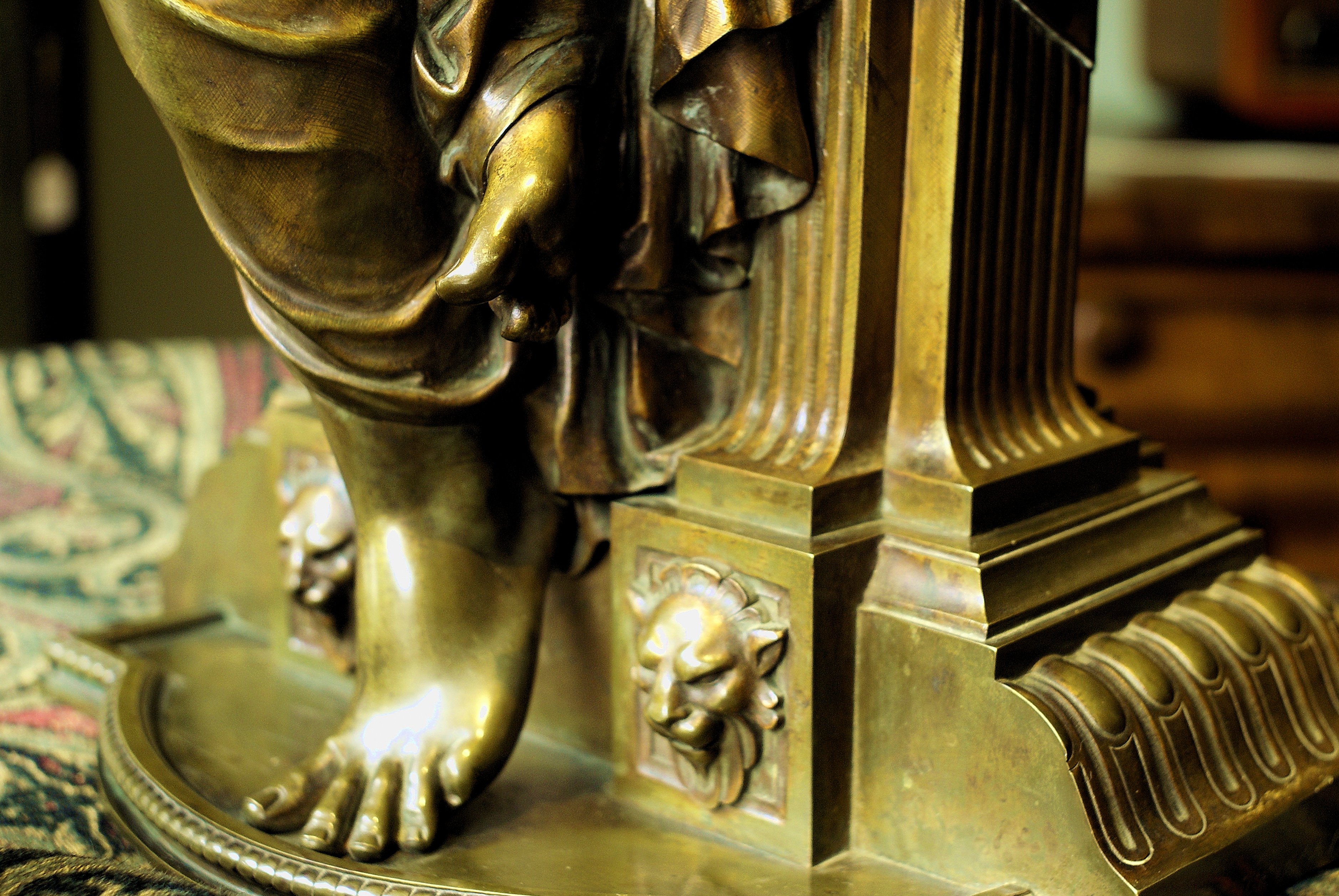 這件名為《少女》的銅雕作品,是杜梅格1870年的作品,少女坐在古典風格的柱石上,一隻手按住胸口上似乎將要垂落的長袍,側頭看向另一方,面容與雙手姿勢,線條柔美,飾有獅頭浮雕的古典直線凹槽台柱,與女子身上隨軀體曲線而彎曲轉折的袍子,形成明顯對比,讓柔美的女體有了堅實的依托。少女側過臉的瞬間,似乎成了一種永恆的凝結,令人好奇,在反覆觀看中,浮現各種想像,可說是件值得一再賞析與收藏的作品。