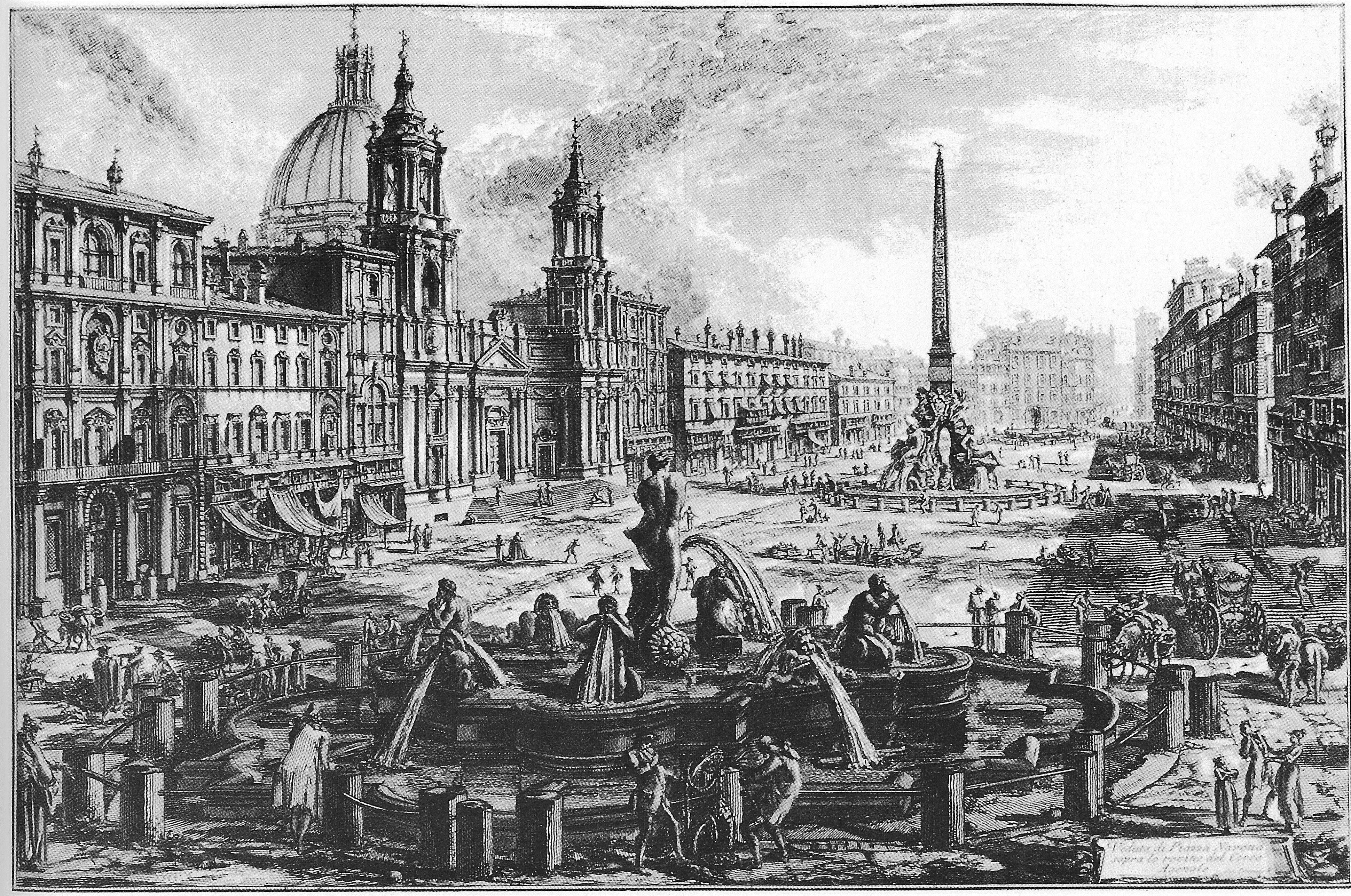 納沃納廣場(Piazza Navona):羅馬的一座廣場,原為西元一世紀古羅馬的競技場,十五世紀末闢為市場。貝里尼(Giovanni Lorenzo Bernini, 1598-1680)設計了廣場中間著名的四河噴泉(1651年)。