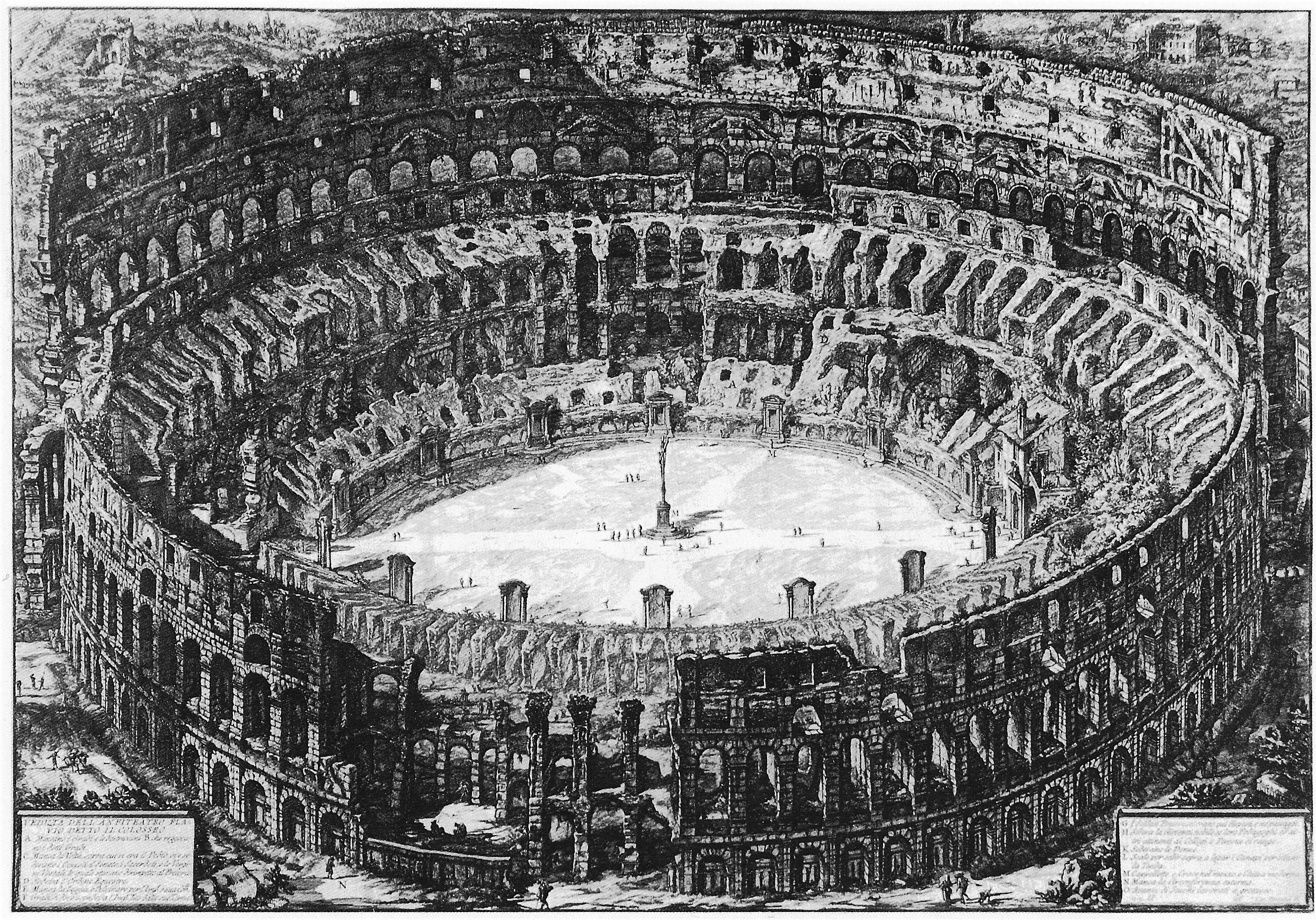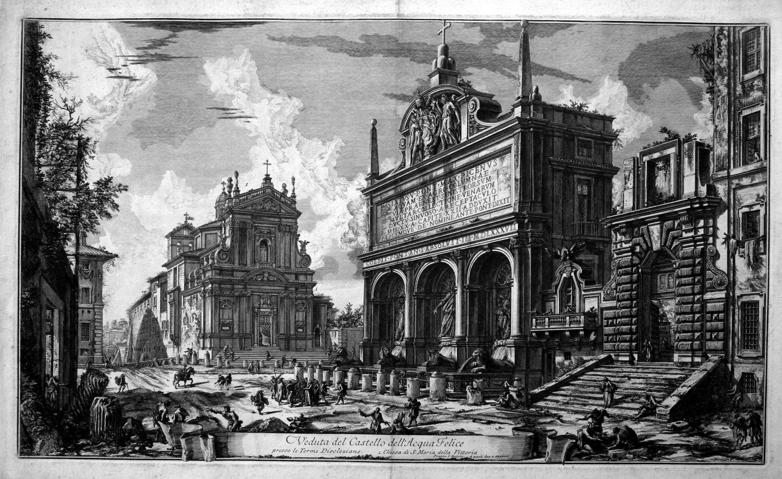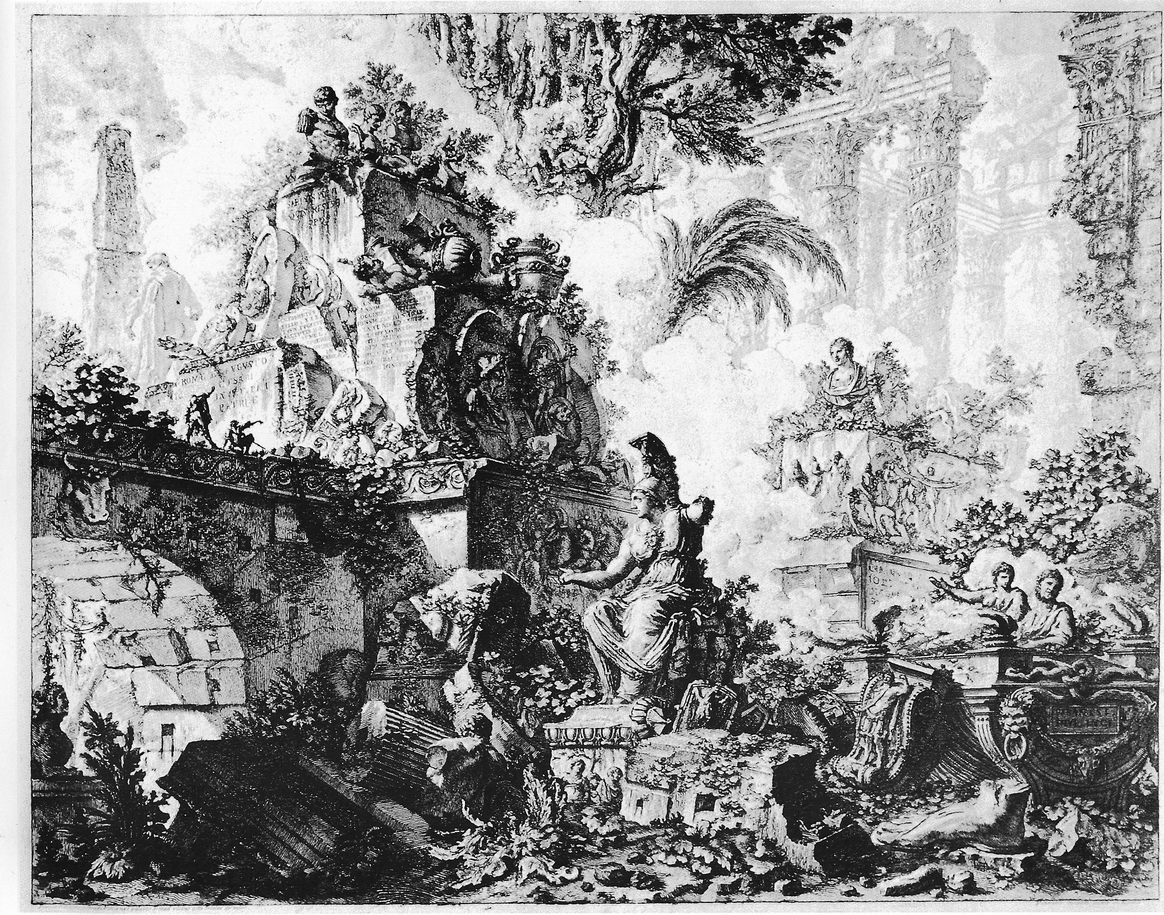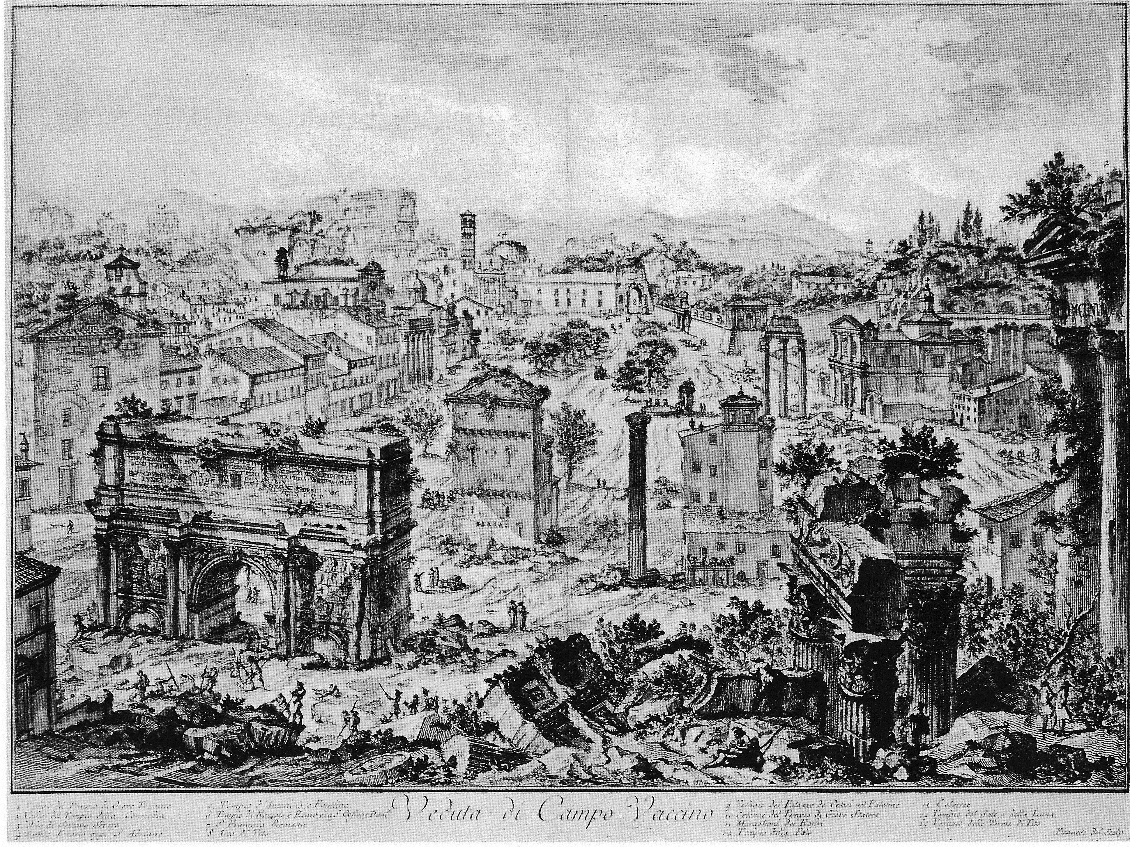 一七五○之後,皮拉奈奇在羅馬繼續研究學習,深入古代建築,偏愛羅馬式宏大的建築風格,同時系統性地對當時羅馬的城市景觀及古羅馬的建築遺跡,進行蝕刻版畫的刻繪。羅馬曾為古羅馬帝國首府的城市,亦是西方中古時期教皇政權的所在,文藝復興的輝煌年代,更是留下令人瞠目結舌的建築與藝術作品。然而,到了十八世紀,羅馬和其他的義大利城市一樣,彷彿垂暮的老人,只能供人憑弔。在皮拉奈奇的羅馬景觀圖中,他把鄉愁轉化成為新的美感經驗,成為深具詩情的作品。他將弔古懷舊與古代宏大的建築遺跡結合起來,時而凸顯遺跡的宏偉力度,時而在遺跡上加上叢生的蔓草,緩和建築物的尖銳線條,並以此增加斑駁老舊的蒼老質感。羅馬景觀中的眾生百態,既有芸芸眾生的喧鬧豐盛,亦有各種階層的獨特風味,這些點景人物成了他建築刻繪中不可忽視的一環,也是他能在版畫藝術中出類拔萃之處。他並不只是單純記錄當時的羅馬,而是以其藝術巧思規劃出一個夢幻城市,一個屬於他自己心目中理想的人類居所。