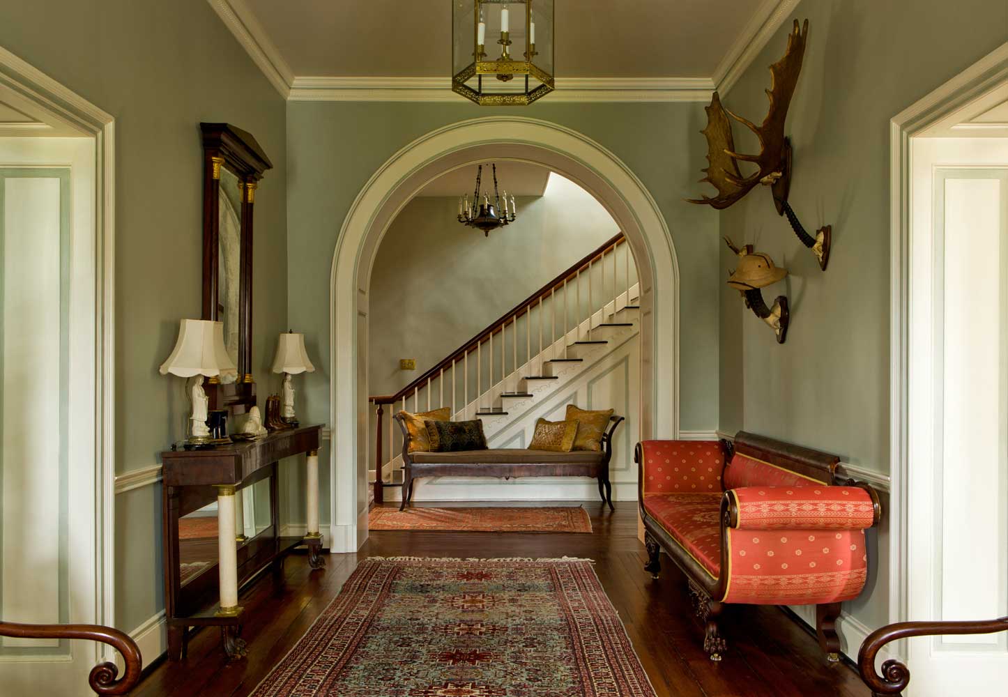 推開舊式的雙開門進入門廳,映入眼簾的是優雅的灰色調,每件家具的擺放都維持在一種和諧的平衡。雙啟的大門、對稱的畫作、兩張法國復辟時期風格的紅色扶手椅,軟墊使用的布料與另一張美國帝政時期的古董沙發同為史卡拉曼德家飾(Scalamandré)的紅色絲綢,牆上掛上好幾件獸角雕塑,歡迎蒞臨狩獵之鄉。