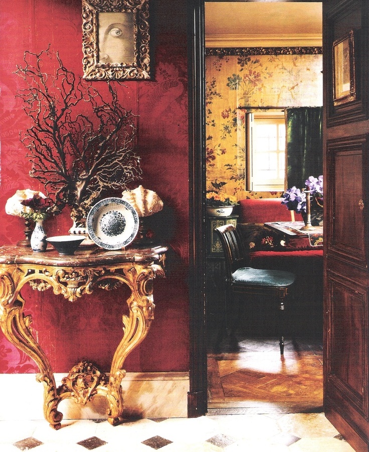 走上公寓三樓,你會驚艷於其中的彷彿萬花統般的豐富——滿溢的色彩,花卉圖案以各種形式綻放呈現。首先,映入眼簾的是鋪有棗紅色錦緞牆面的門廳,裝飾著一張搶眼的路易十五時期的金色木製邊桌,地板來自義大利南部十九世紀的黑白石板。餐廳的紅色絨布沙發延續了門廳的紅,當萊拉的孩子們前來過夜時,攤開來便是一張沙發床。餐廳的牆上則換成了黃底印花壁紙,桌椅皆選用十九紀初的古董家具,不過,你會看到餐桌正上方的木製塗金吊燈,那是一件從巴黎跳蚤市場帶回的戰利品。料理食物的廚房,由於空間極為狹小,則使用了柔和的淡藍與乳白二色作為主色調,在視覺上,便顯得不那麼擁擠。