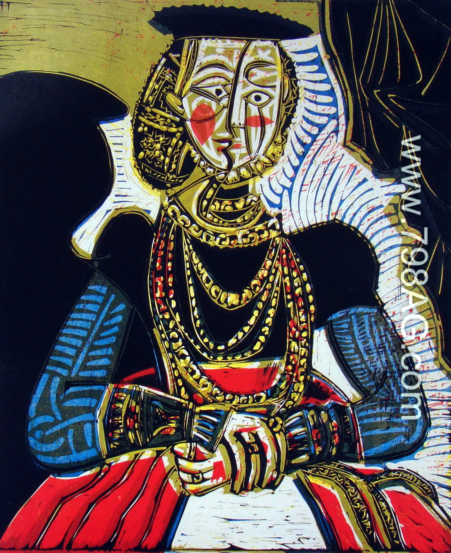 圖八:《仿小克拉納赫的女子圖》(Buste de Femme,d’apres Cranach le Jeune),1958,彩色膠版,77.5 x 57.2 cm。這時期的畢卡索經常運用前輩大師的構圖與題材,加以變形改造,以對話方式開發藝術表現的新素材及理念。