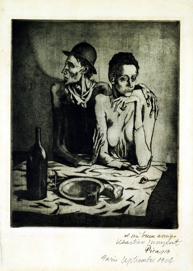 畢加索(Pablo Picasso , 1881-1973)在進入立體主義創作前的「藍色時期」及「粉紅色時期」,即開始了版畫創作,到了晚年依然創作不輟。他運用了各種版畫技法創作了二千多件版畫作品,如同他豐富的藝術生涯,他的版畫世界一樣多彩多姿。在一九○四年的蝕刻作品《簡陋的膳食》(圖一),畢加索透過身形瘦削的一對夫妻及桌上寒酸的食物,表達出他在「藍色時期」的憂鬱生活。在隨之而來的「粉紅色時期」中,他開始描繪馬戲團中的各色人物,展現出強調輪廓,具有韻律的蝕刻線條(圖二、圖三)。這種律動式的線條在畢加索的立體主義版畫作品中,也重複出現。在立體主義時期,畢加索的版畫線條顯得大膽而嚴謹,在構圖上也較思慮周密。但在這段期間,他已逐漸對立體主義簡化造型的方式,感到不滿,因而不斷嘗試不同的題材,藉以豐富立體主義的內涵。這時期的經驗,讓他後來能夠純熟運用立體主義的要素,發展自己獨特的風格。