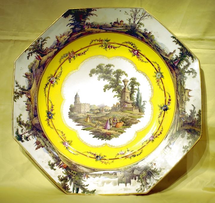 這客瓷盤外緣描繪著古典田園風光,畫師經營的景緻豐富迷人,彷彿視覺饗宴。瓷盤中央畫面襯上鮮黃的釉色,佐以植物花圈,安靜恬雅的畫面浮現其中 — 男男女女行樂笑談,遠處城堡壯麗,富有古風的噴泉塔台矗立近景,情境悠閒而富裕,曖昧情愫不言而喻。十八世紀法國貴族階層偏愛這種風格,史稱風華盛宴(fête galante),亦是洛可可藝術不可或缺的一部分,源自法國十八世紀大畫家華鐸(Jean Antoine Watteau, 1684–1721)的繪畫創作。華鐸畫中穿著華麗的貴族悠遊於想像的田園風光,愛情追逐是其重要主軸,打破巴洛克的傳統畫面,為自然添上了強烈的戲劇張力。此後,華鐸風格蔚為風潮,各類工藝品上不時點綴在自然世界中行樂的戀人,這客瓷盤便是最佳見證。
