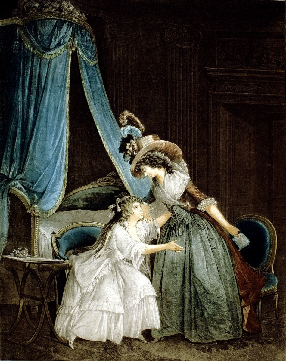 這幅版畫作品,乃是版畫藝術家傑尼特複刻肖像畫家尼可拉斯.拉弗倫斯的油畫作品,畫面以法國女性的閨房意趣為主,在私密的閨房空間裡,兩位女子分享著閱讀信件的樂趣。畫面中央身著華服的來訪女士,將信件藏於身後,居高臨下地凝視著閨房女主人。女主人似在要求友人將信件交回。閱讀桌上半開的抽屜、床邊的會客椅等,安排得當的擺設,說明閨房主人的尊貴身份。雍容華貴的時尚穿著與當時巴黎流行的羽毛帽、寢具質料與家具搭配鮮花與流蘇,形成另一種閱讀的特殊氣氛與情趣。畫家在一方畫面上,充分展現鋪陳張力,版畫家傑尼特更以高超的手法,結合數種彩色銅版技法,如細點技法、粉末腐蝕法…等,在忠實呈現原作風格下,為複刻作品增添不同的精緻效果。