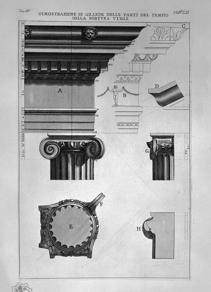 義大利藝術家皮拉奈奇(Giovanni Battista Piranes, 1720-1778)繪製的門神與牲畜之神波圖努斯神殿(Temple of Portunus),愛奧尼柱式,出自:【羅馬古物】(Le antichità Romane. Tomo IV, tav. LII.), Paris, 1835-1839。圖片出處。