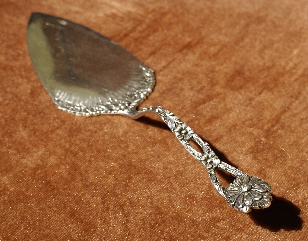 此款銀蛋糕鏟柄部與剷身頂部飾有雛菊圖案,鑄造與敲打精細,造型獨特。