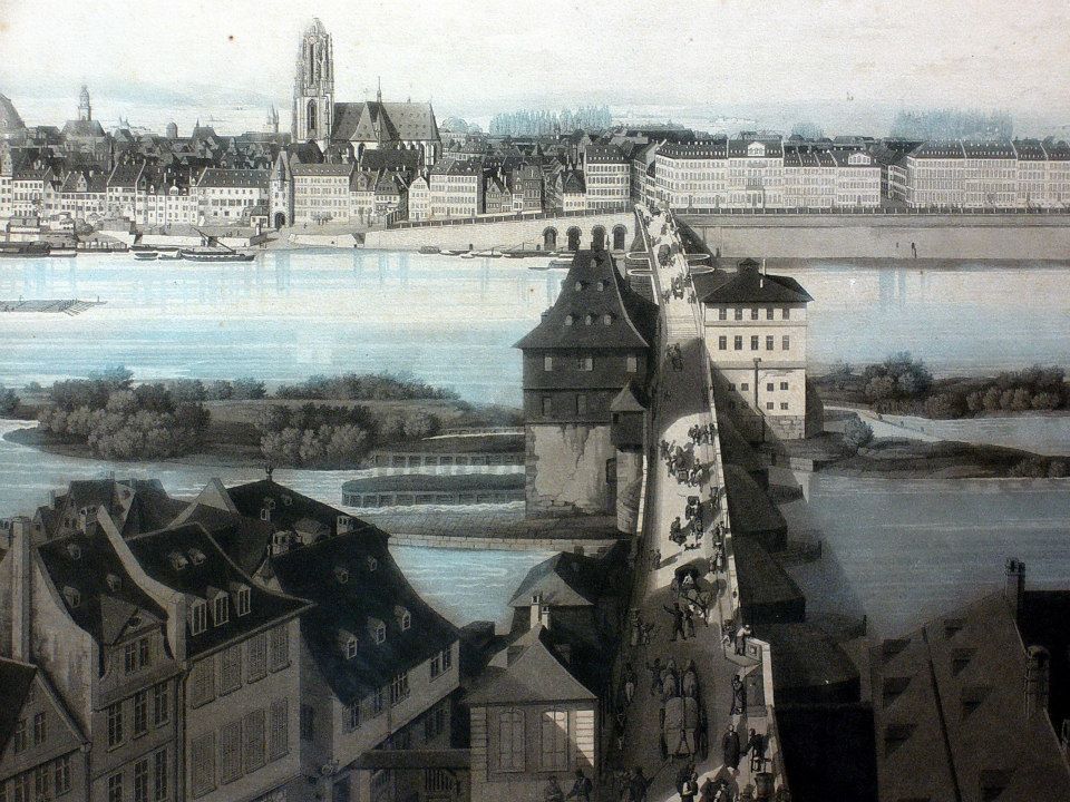 作品介紹:這是德國重要商城法蘭克福的景觀圖,由當時曼河對岸的薩克森豪森區(Sachsenhausen)的教堂德國之屋(Deutsch Haus, 今Deutschordenshaus)塔樓上鳥瞰該城市區。當時的大教堂(Sankt Bartholomäus)塔樓尚未完工,而1833年完工的保羅教堂(Paulskirche)已出現在舊城區左側。法蘭克福自中世紀起,即成為當時神聖羅馬帝國的自由王城,為歐洲貿易路線的匯集地,數百年來,為神聖羅馬帝國皇帝的加冕所在,後發展成為歐洲重要的貿易與金融城市之一。