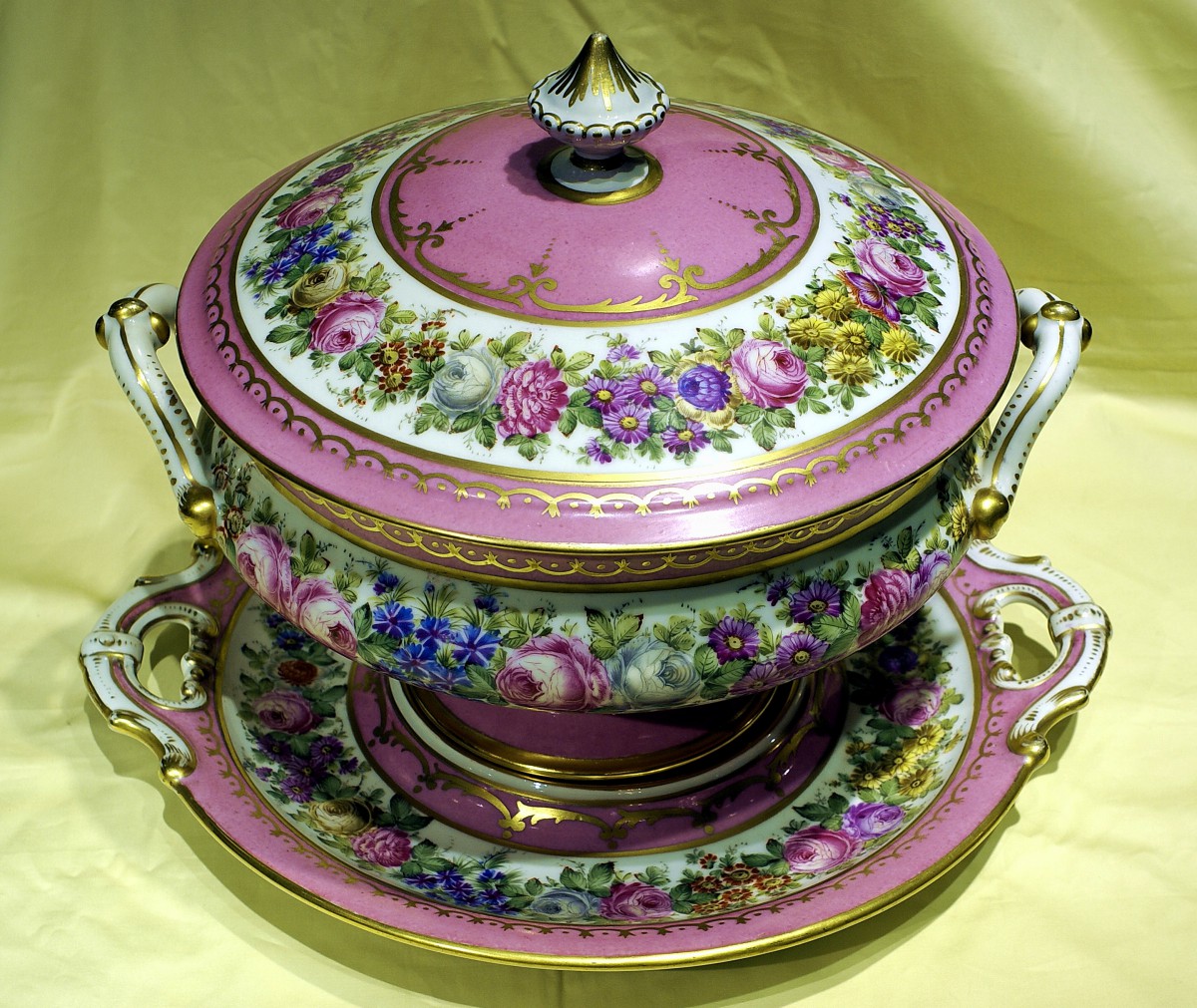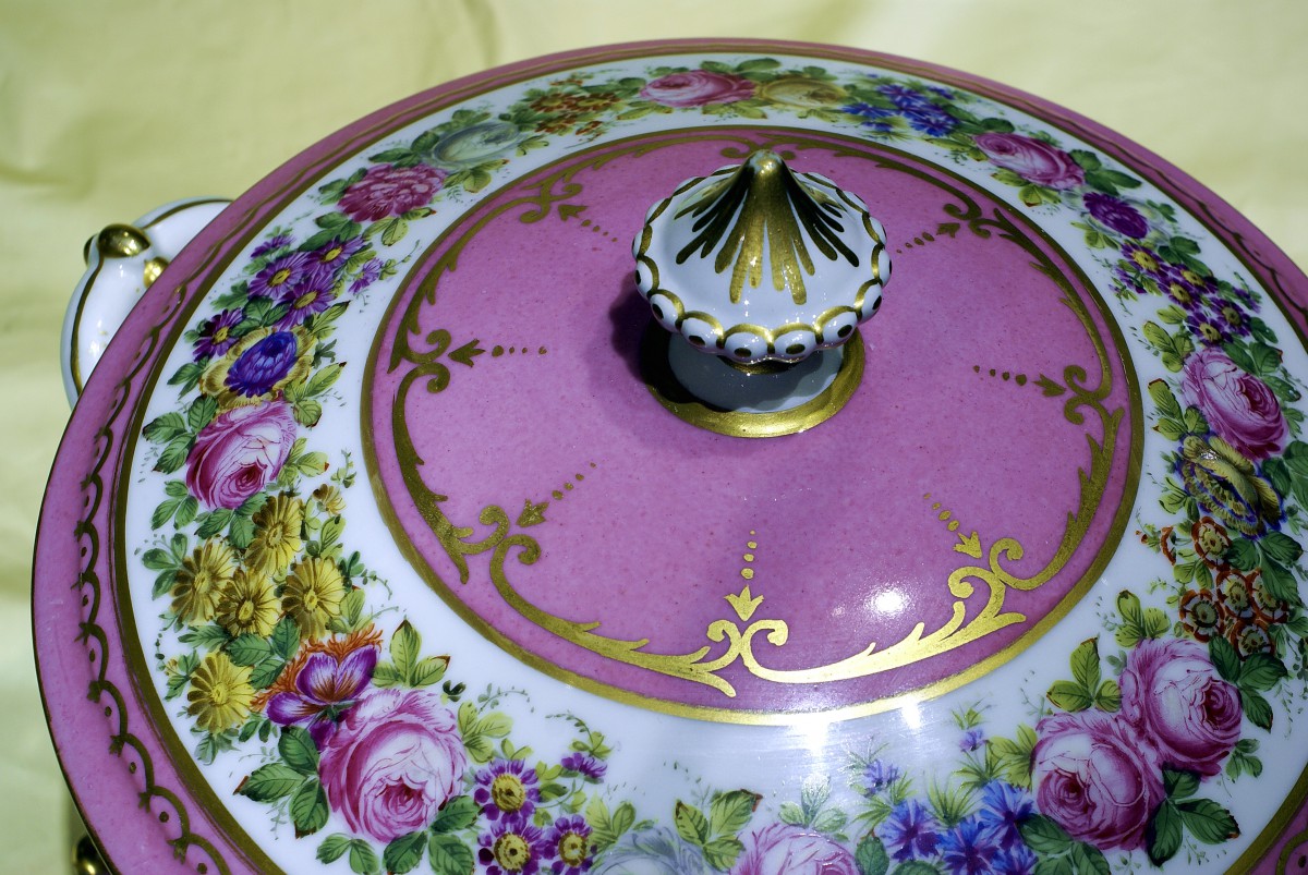 1756年,法國國王路易十五在賽佛爾(Sèvres)設立了法國王室的官窯,為自己與顯貴人士製造瓷器(推薦閱讀:美麗的瓷器書籍:《賽佛爾瓷器》),而在十八世紀七0年代後,巴黎地區也出現了不同的民窯,有的甚至獲得貴族的贊助,採用賽佛爾的造型與裝飾圖案,甚至也聘請賽佛爾的藝師操刀,發展出所謂的巴黎窯產品。這些巴黎窯產品有的有其特製的落款,但也有許多沒有落款的產品。這款玫瑰花飾粉紅釉彩湯盅便無落款,從瓷胎、彩釉與玫瑰花飾的圖案來判斷,應為十九世紀初巴黎民窯的作品。粉紅彩釉可說是賽佛爾瓷窯的代表釉色,源自十八世紀法國洛可可時代的略帶夢幻的輕盈風格,為瓷器造型增添一股溫雅華麗。