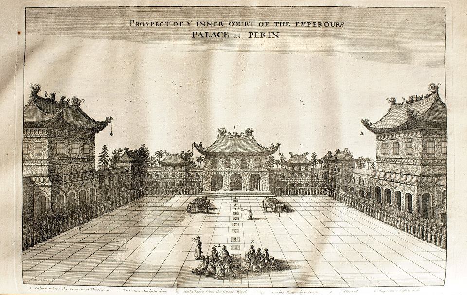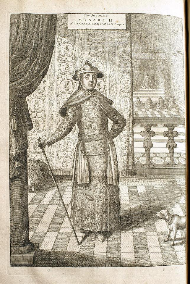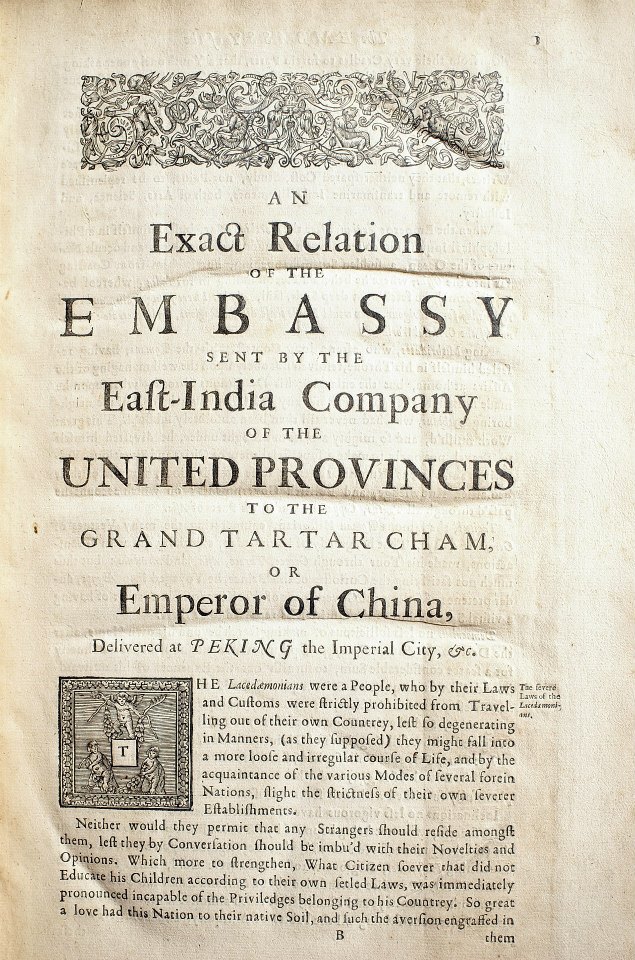 這部古籍為約翰‧尼霍夫《荷蘭使節出訪中國記》(Het Gezandtschap der Neêrlandtsche Oost-Indische Compagnie, aan den grooten Tartarischen Cham, den tegenwoordigen Keizer van China)英文版第二版,1673年出版。英文版可能未經授權,圖片部分未使用原來的銅版刻版,而是重新刻製。書名頁插圖便委由當時在倫敦的捷克知名銅版藝師何拉(Wenceslaus Hollar, 1607-1677)複刻。內文的其他插圖可以看出英國當時的銅版製作工藝,與歐陸有一段差距。為了吸引讀者,英文版還節錄了1667年德國耶穌會修士阿塔納斯·珂雪(Anthanasius Kircher, 1602-1680)出版的《中國圖誌》(China Illustrata)的部分內容。珂雪可說是當時歐洲最知名的學者,他的《中國圖誌》匯集了當時出使中國耶穌會教士的紀錄與書信,而以他的博聞彙整而成的中國知識百科全書,既包括詳細的地圖,亦記錄了當時中國政治經濟的各個面向。英文版約翰‧尼霍夫《荷使出訪中國記》在這樣的基礎上,將當時歐人對中國最先進的兩套知識體系彙整起來,主導了之後英國人對中國的印象。