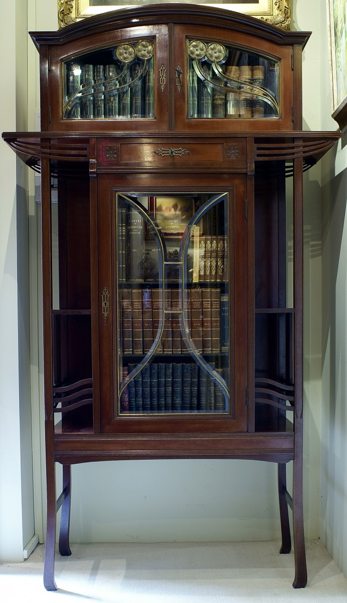 這件新藝術展示櫃,直線曲線相互交織,低調中呈現新藝術的浪漫情懷。遠觀,櫃子彷彿小型的建築,中間的主體高聳,幅度宛如新月的拱頂下,配置了雙扇櫃門與單扇櫃門,左右各有四個鏤空置物台,優雅的線條筆直而下,而以圓滑的櫃腳收尾,整體造型看來簡約,卻隱含許多創意巧思,除了呈現工匠精細的工藝之美,各種蜿蜒的線條,亦增添許多材料成本,可以想見當初的高昂製作費用。玻璃櫃門也以繁複的製作工序呈現,銅條鑲嵌玻璃,加上敲打與雕刻製作的罌粟花銅片,畫龍點睛,流露出德國新藝術設計的簡約低調風格。此件作品不僅整體造型優美,細節製作謹慎,值得細細鑑賞。