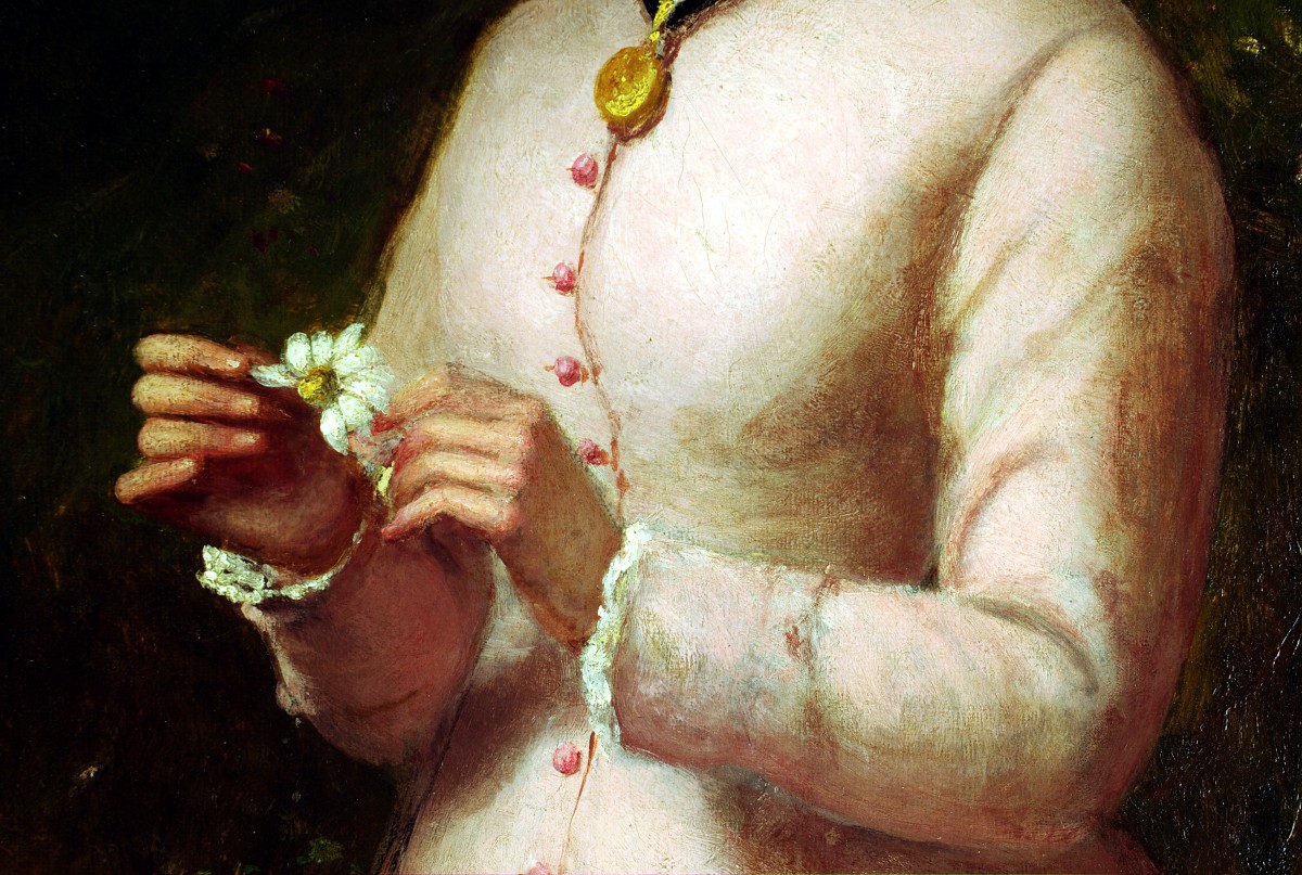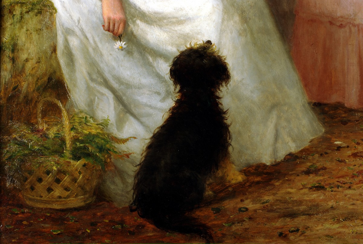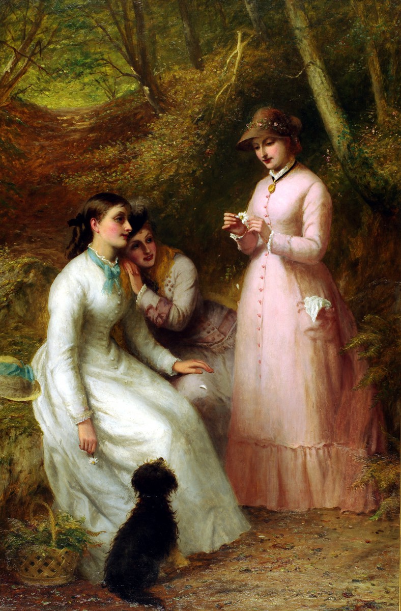 但他最膾炙人口的作品,當屬許多甜美的仕女肖像。這些仕女出現在如畫的風景中,出遊行樂,有搖船摘蓮,有顫微微跨過小溪,或像本幅畫中的三位女子一樣,為情所困。儘管這幅名為《愛的測驗》的畫,沒有屬名,但布魯克斯特有的風格與筆觸,不會讓人誤為其他畫家所作。女子的神韻、服飾、姿態動作,到小狗與花籃,都是布魯克斯慣用的繪畫語言,甚至和他其他作品相比,更多了一份流暢。捻花占卜愛情的遊戲,似乎也是維多利亞時期的一種時尚。布魯克斯保留了前拉菲爾畫派經營畫面氣氛的色彩與細節,卻更加入世,他筆下的女子,沒有史詩故事的沈重包袱,顯得無憂甜美,健康開朗。
