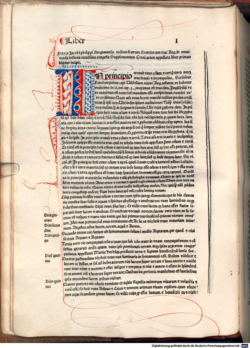 《年鑑補遺》一書,在搖籃本時期,已知的版本有五種。1483年,第一版在義大利威尼斯,由貝納流斯(Bernadinus Benalius, 約1458-約1543)印製出版;1485年,第二版在義大利布雷西亞(Brescia)出版,由波李諾(Bonino De’ Boninis, 1454-1528)印製;1486年,第三版在威尼斯出版,再次由貝納流斯印製,這個版本增加了木刻插圖;1490年,第四版在威尼斯出版,由里楚斯(Bernardinus Rizus, 生平不詳)買下貝納流斯的插圖印版,並增補了巴別塔與大幅威尼斯、羅馬、維洛納與熱那亞的城市景觀插圖,其中的羅馬插圖,應為羅馬最早被印製出來的景觀插圖;1492年,第五版仍由里楚斯在威尼斯印製,但未依照前一版的排版,而是改版,特別的是,將原先位於第一頁獻詞中的拉丁書名Supplementum chronicarum,單獨抽出,成為書名頁,原本置於內文前面的索引(Tabula),放置到內文之後,已可看出現代書籍的雛形,在插圖部分,緊接書名頁,增加了一張上帝創造天地的全頁插圖,但拿掉原本第一卷中上帝造人的插圖,另加上一張諾亞方舟的插圖。
