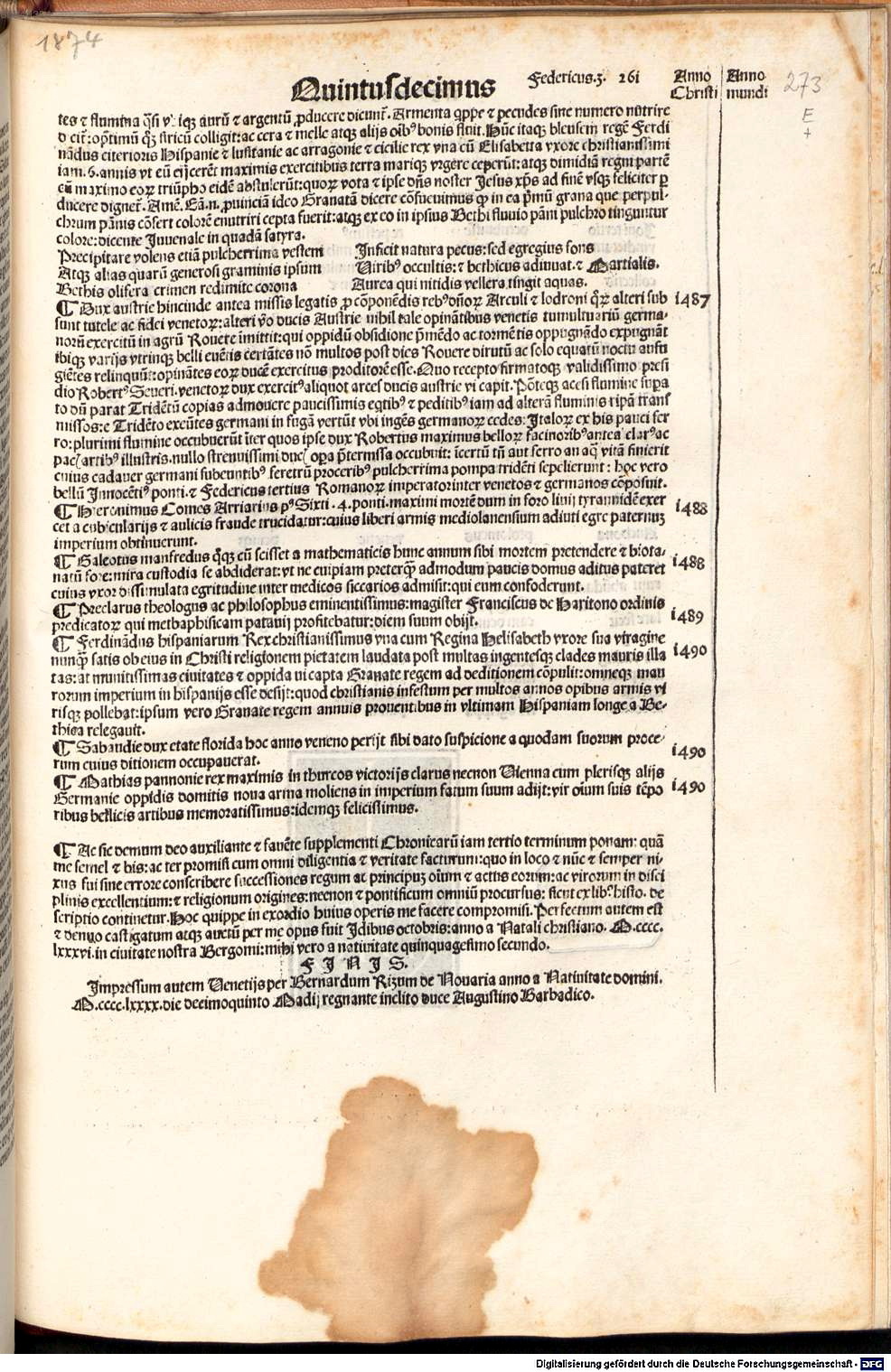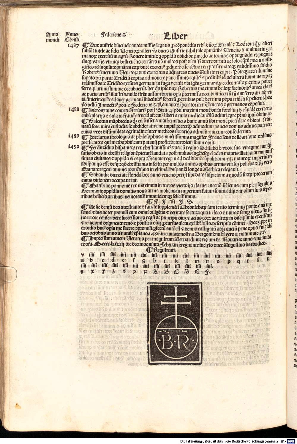 《年鑑補遺》第三版書末出版印記,註有印刷作坊名字與出版時間:1486.12.15。