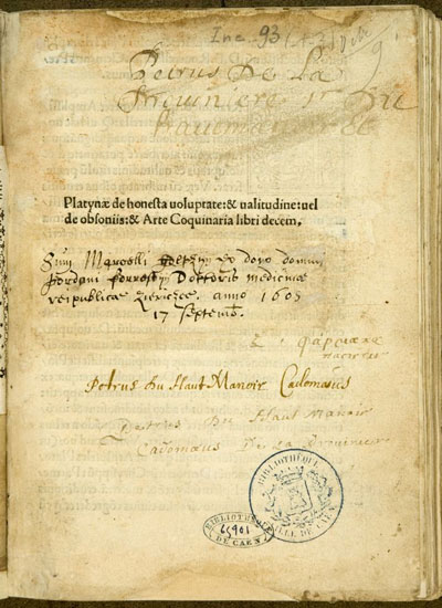 達文西藏書中唯一一本與烹飪和食物相關的書籍,為人文主義者與美食家巴托洛梅歐‧薩奇,又名普拉提納(Bartolomeo Sacchi/ Il Platina 1421 – 1481)所著的《論正當娛樂和健康》(De honesta voluptate et valetudine),被視為世界上第一本印製出來的食譜書。於1475年出版後,大受歡迎,在一百年間,被翻譯為各種語文譯本,且不斷再版,成為當時搖籃本中的暢銷書【關於搖籃本,還可參閱:從《年鑑補遺》(Supplementum chronicarum)看西方搖籃本古籍】。也許因為作者普拉提納對簡單食物的主張,引起達文西共鳴,而十分推崇他。普拉提納是梵蒂岡的圖書館館長,在他的作品中有二百五十道食譜,其中二百四十道是直接取自他的好友,當時羅馬的明星主廚馬提諾(Maestro Martino)於1460年代寫作的《論烹飪藝術》(Liber de arte coquinaria)一書(未正式出版,僅為手寫草稿)。在文藝復興時期,沒有著作權的概念,也不會在書中載明出處;但不可否認,因為普拉提納的「剽竊」,讓馬提諾這本食譜更廣為人知,成為另類的宣傳方式。