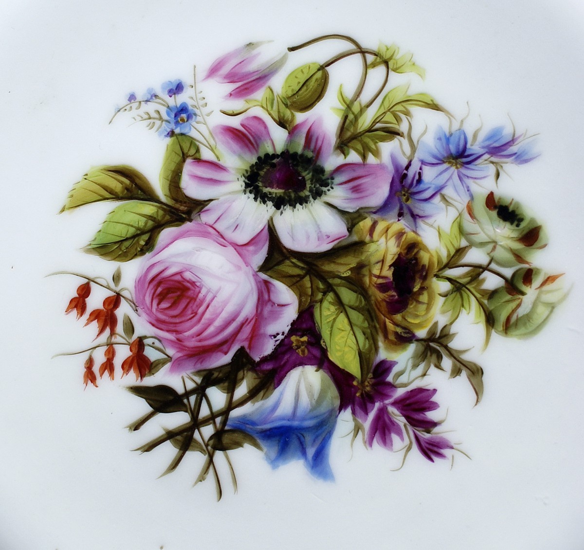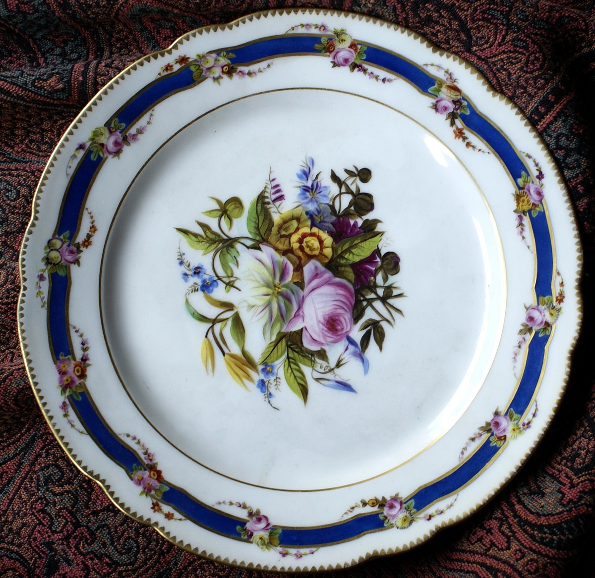1756年,法國國王路易十五在賽佛爾(Sèvres)設立了法國王室的官窯,為自己與顯貴人士製造瓷器,而在十八世紀七0年代後,巴黎地區也出現了不同的民窯,有的甚至獲得貴族的贊助,採用賽佛爾的造型與裝飾圖案,甚至也聘請賽佛爾的藝師操刀,發展出所謂的巴黎窯產品。這些巴黎窯產品有的有其特製的落款,但也有許多沒有落款的產品。我們這組瓷盤(六客)便無落款,從花環、金邊與花卉的圖案來判斷,為賽佛爾窯廠常見的裝飾與色彩,應為巴黎窯的產品。中央的花卉繪製典雅細緻,寫真傳神,出自巧匠之手;盤緣金邊與花環飾帶,同樣考究,藍色滾邊點出這組瓷盤與法國官窯賽佛爾的淵源。