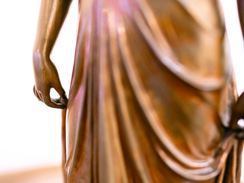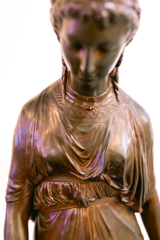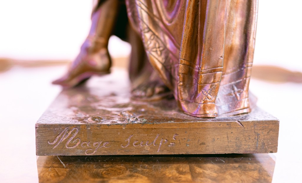 這座銅雕,約莫是十九世紀末的作品,由法國雕塑家法郎斯瓦・馬格(François Mage, 1826-1910),他雖非赫赫名家,卻也開創出新的普羅市場。這尊雕像迷人之處,在於衣服皺褶的處理。女子低著頭,手撩起衣擺,製造出更多的皺褶曲線,胸下與腰間的兩道束腰,束出了更多複雜的摺痕。圓柱形的衣袍本來是自然地垂下,因著這些細節動作,有了不同方向的改變,讓看似凍結住的瞬間動作,變得豐富起來。