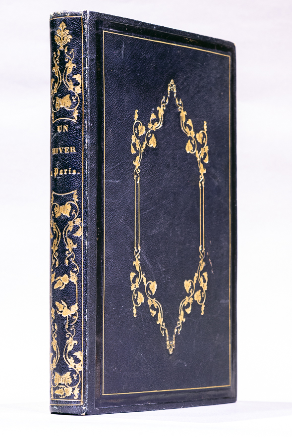 談到浪漫主義,以中文的想像來解釋,絕對失真,這個源自十八世紀德國的文藝運動,是在顛覆當時的貴族與專制政治文化,對於那時代的強烈理性,也多所反抗。強烈感情是浪漫主義的基礎,如不安、恐懼,和對大自然的敬畏,他們觀照的是人的可能潛力。十九世紀上半葉,浪漫主義在各處開花結果,在書籍裝幀藝術上也留下美麗的烙印。這個時期的裝幀喜歡運用細線與植物花葉來設計圖案,燙金線條在曲線與直線中交互穿插,花葉也帶上了不同的捲曲樣式,新古典主義的對稱雖然保留,但新古典偏愛的書封邊框,慢慢被中央部位的裝飾取代。這本【巴黎之冬】的書封設計,便是典型的浪漫主義裝幀。書封邊框現只留下方形的燙金細線,中央部位則透過捲曲的葉片花飾,架構出如上下封蓋的圖案,書背部分,也在上下兩個如藤蔓般的結構中間,安置了書名。
