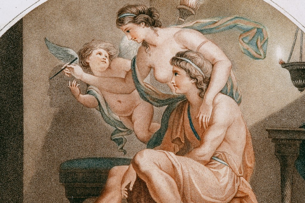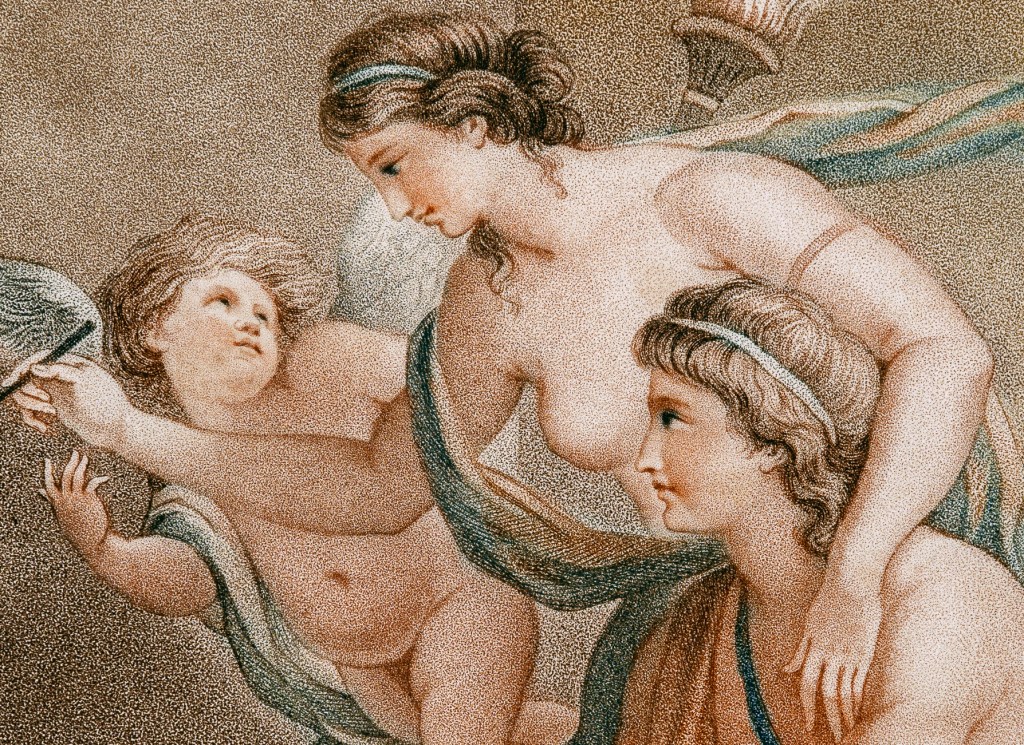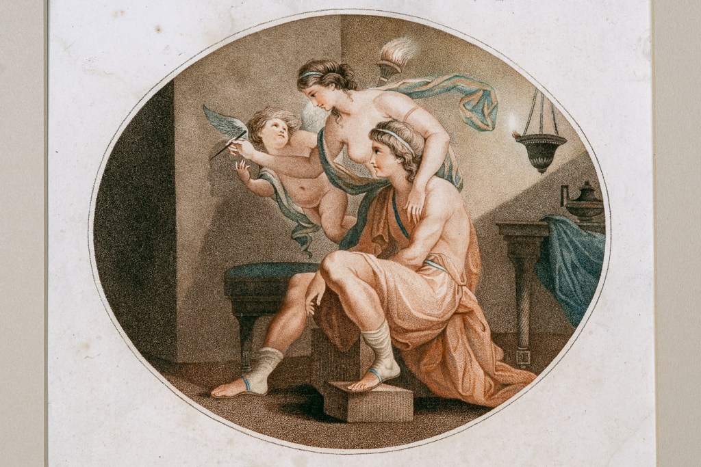 這張版畫作品,見證著十八世紀彩色銅版的一個高峰,是以細點技法製作完成。細點技法基本是蝕刻技法,主要使用粗細不同的滾輪式刻刀,或運用於粉筆效果技法上的球狀刻刀,造成點狀構成的畫面後,繼續加以腐蝕完成,也有不經腐蝕過程,以直刻方式完成的細點技法作品。細點技法的畫面由粗細不同、濃密不一的點構成,形成柔和細膩的效果,並以此取得構成色調的面,適合表現色彩。其中,尤以義大利人巴托洛奇(Francesco Bartolozzi, 1727-1815)為此一技法的代表人物,也是這張版畫的作者。他在佛羅倫斯出生,父親原本希望子承父業,讓他成為金匠,然而他偏愛平面藝術,轉而至威尼斯習藝,最後精通銅版蝕刻的技法,既自己創作,也複刻許多大師的畫作與壁畫,名聲逐漸傳至歐洲其他地區。1764年,他來到英國,很快成為王室御用版畫師,一待便將近四十年,在英國藝文界有著舉足輕重的聲望。他不僅習得在英國風行的銅版細點技法,並精益求精,成為此一技法的翹楚。他的作品為數眾多,其中較為傑出的,都流露出優雅柔美的氣質,且偏愛紅色、橙色與棕色印墨,而非當時主流的黑色。巴托洛奇名重士林,自己的作坊中學生及藝師多達五十多位,複製當時英國重要肖像畫家的繪畫作品。1802年,他轉往葡萄牙里斯本,協助王室印刷坊更上層樓,最後亦埋身里斯本。