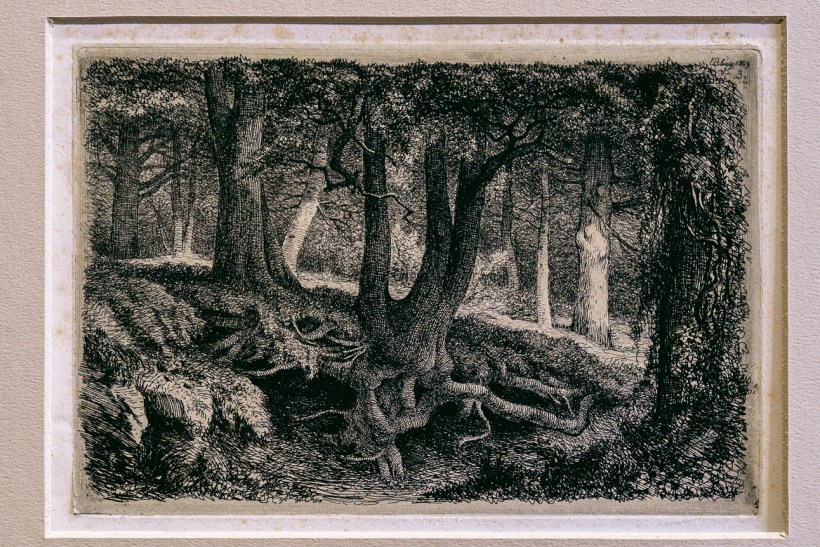後來的巴比松畫派與印象派,基本上推崇戶外寫生,也以此來模塑作品,但尤金・布萊里仍比這些畫家早了一步,帶著事先準備好的銅版,直接在戶外刻繪所見的風光,可說是那個時代寫生藝術家的先行者。而在蝕刻的創作上,他也留心各個階段,從準備版面,到刻製與腐蝕,以及最後的印製,都付出相當的心血。還未完成的作品,他不會銷售,對他而言,那仍是需要處理的版面,對畫面不佳的作品,他便直接銷毀印版。欣賞他的版畫作品,可以見到層次豐富的綿密線條,從深到淺,瀰漫在畫面各處。他對自然的觀察,反映在作品中,發掘許多森林中幽靜、不為人知的角落,彷彿一位森林哲人,踽踽獨行,那些隱密之處,在他看來都如閃爍的寶石。這裡的三張作品,可以清楚體現他的特質。