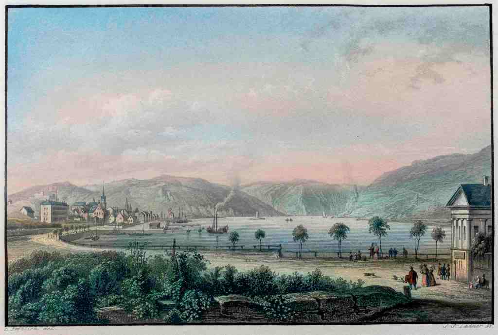 本幅插圖出自1848年出版商G. Zeiler彙編的【萊茵河】(Der Rhein von Mannheim bis Düsseldorf)一書,以細膩的粉末腐蝕法製作書中的畫面,再透過當時手繪師傅的高超敷彩技法,完成全書共二十五張萊茵河中段各個知名景點的插圖,成為今日藏家競相收藏的項目。