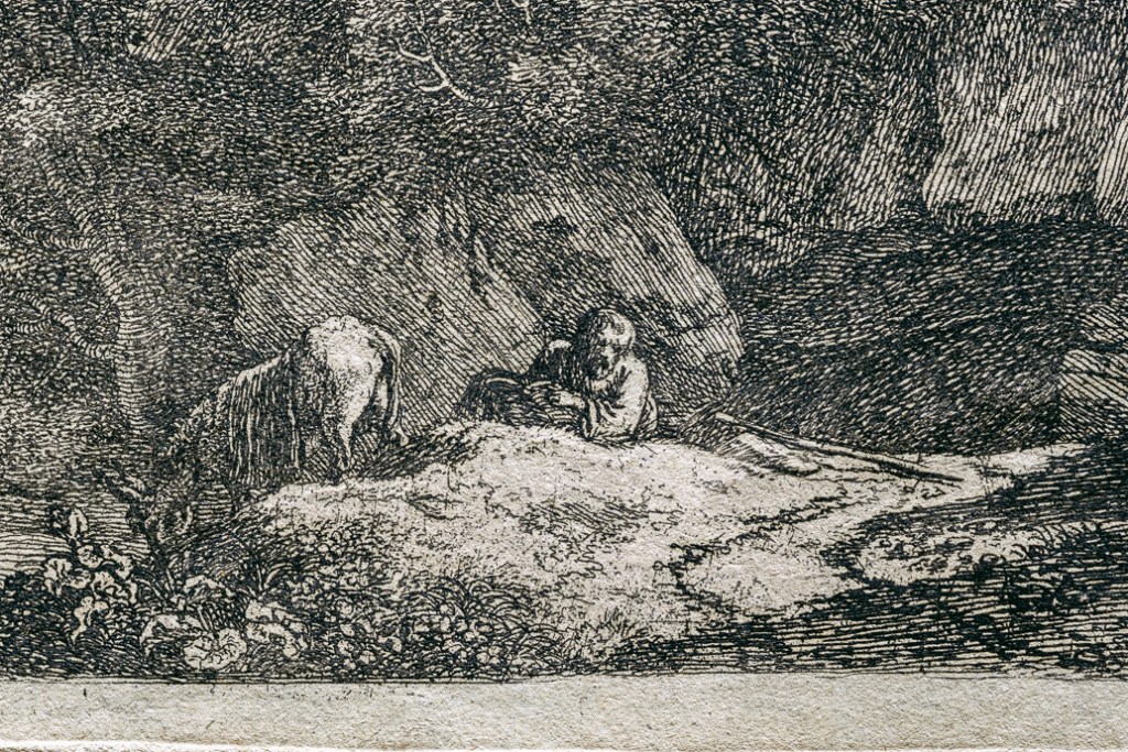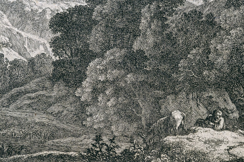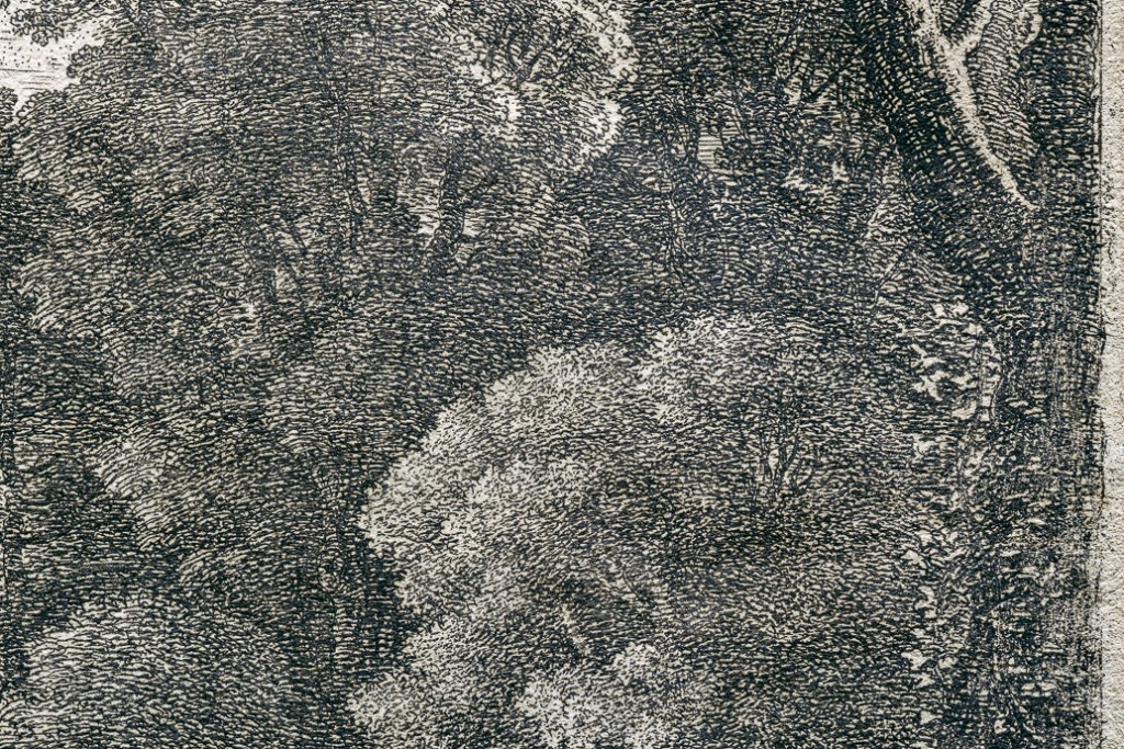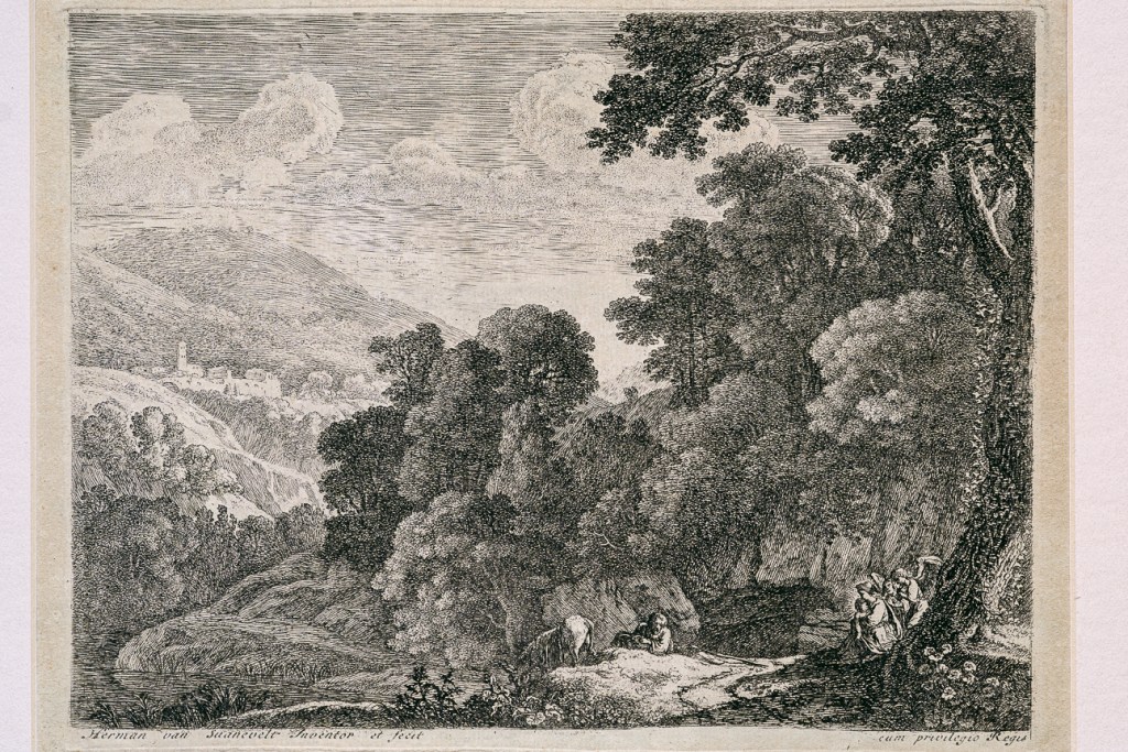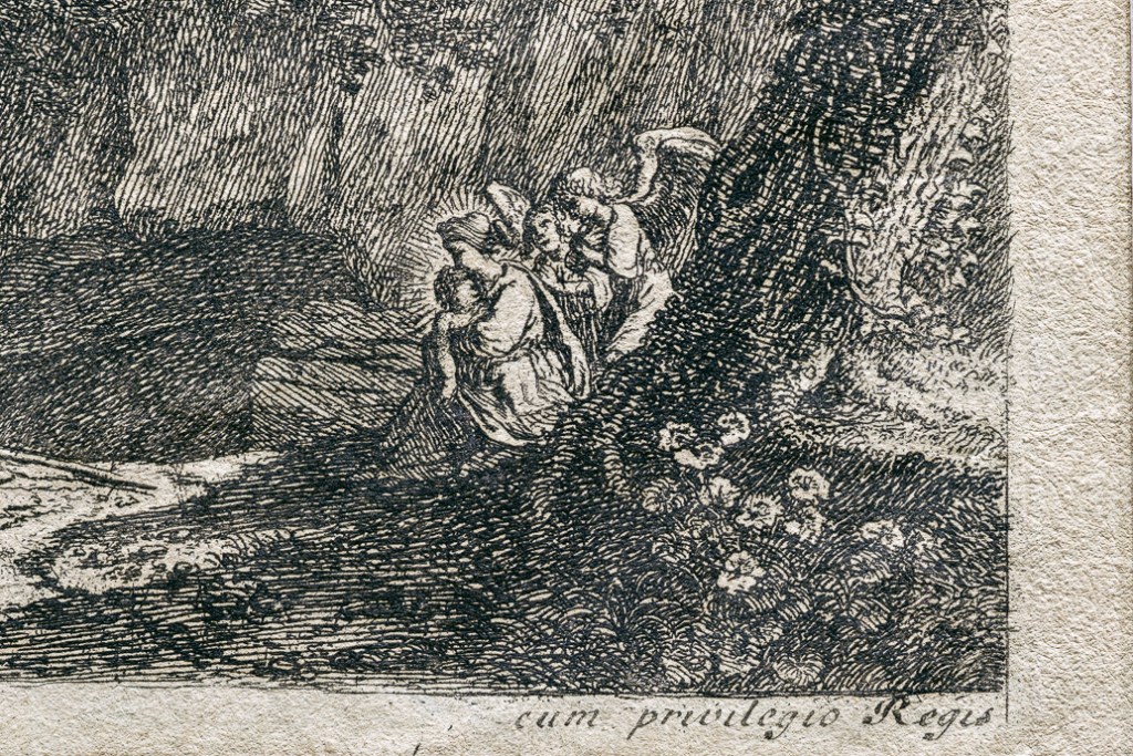 然而,卻是他的蝕刻版畫作品,助他將自己所開創的田園式風景普及開來,同時也決定了直到十八世紀的風景繪畫的發展脈絡,尤其在法國。他的蝕刻作品在質與量上,都勝過當時其他的義大利份子藝術家。我們這件【出逃埃及】的蝕刻作品,應該是史汪能費爾特回到巴黎後創作的,在畫面右下方有 cum previlegio Regis(國王特許) 字樣,也許來自王室的委託。畫面中,他將新約中因為躲避希律王殺嬰的耶穌父母,在神的使者的指示下,逃往埃及的文字,融入在這張風景版畫中。前景茂密的叢林,從左方一池水塘的低矮地貌,以對角線的方向往右上方的高聳樹木延伸,是典型巴洛克繪畫的動態構圖,烘托著逃亡的戲劇效果。