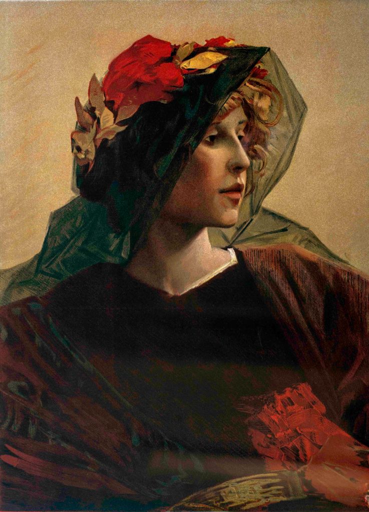 這幅茵裴莉雅肖像,刊於十九世紀末(1897-1899)的法國藝術刊物【現代版畫】(L’Estampe Moderne)中,這份月刊每月刊出四張版畫作品,最後集結成冊,成為法國新藝術的代表刊物之一,亦是今日藏家傾心的收藏品目。刊於刊物中的版畫作品,右下角都壓印上一位女子的側面肖像圖案。