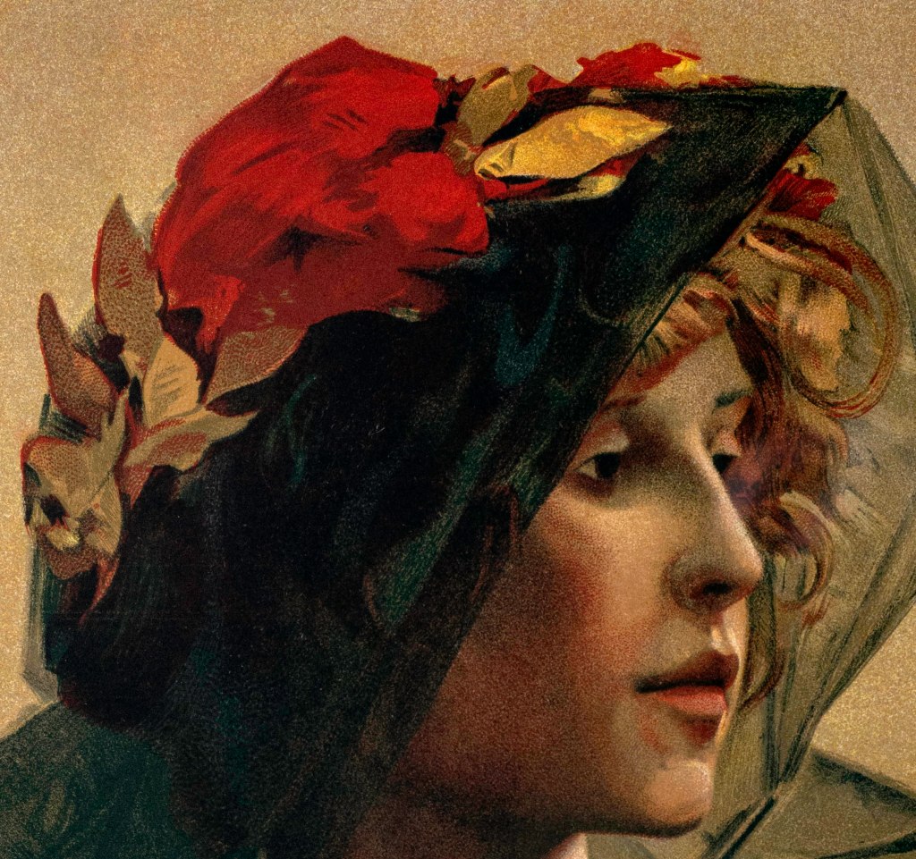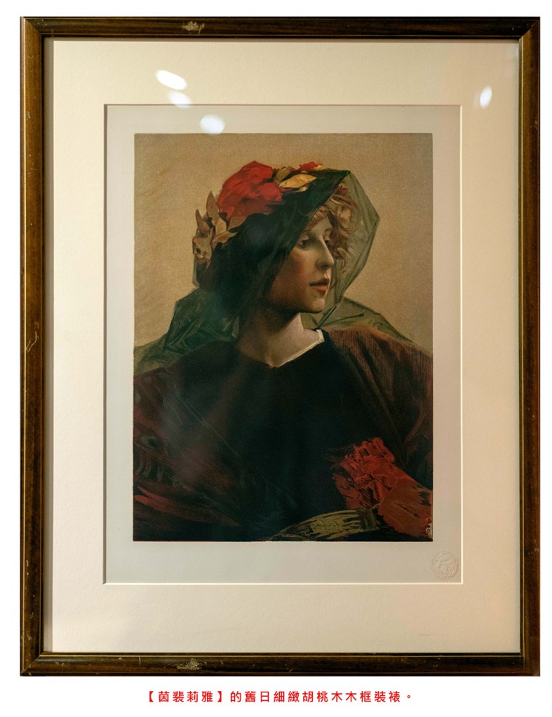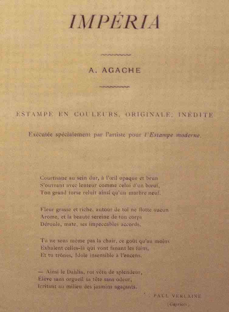 阿嘉西這幅彩色石版以一名時尚的法國女子為模特兒,神色略顯孤傲,彷彿暗藏心事。畫面背面裝裱附上法國十九世紀的象徵主義詩人韋爾蘭(Paul Verlaine, 1844-1896)的【大理花】(Un Dahlia)一詩,隱喻這位絕代風華的名妓奇譎的一生。