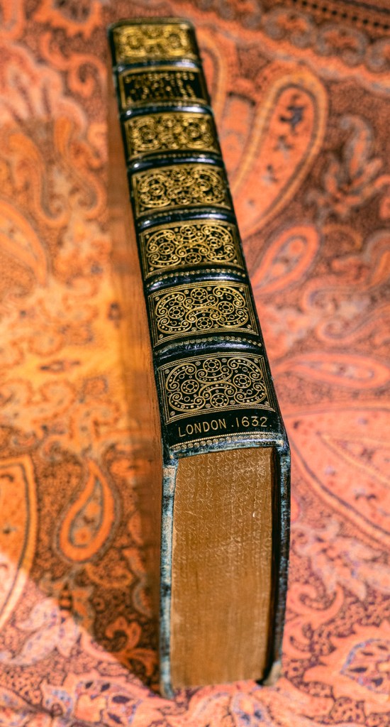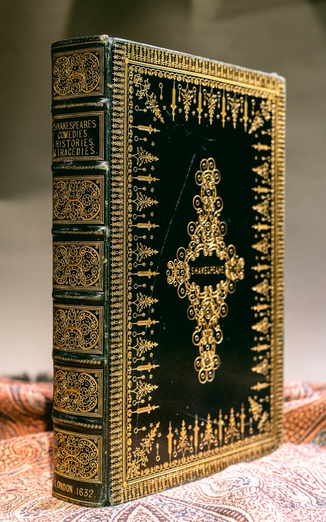 其中的【莎士比亞第二對開本】,雖然可以見到一幀莎士比亞的銅版版畫肖像,但也僅此於此,全書模樣如何,參觀的朋友應該仍是瞎子摸象。個人有幸和這本古書單獨相處了幾天,留下了一些書影,就藉此機會分享,讓大家初步窺看這本珍本的外貌。這本古書在19世紀時,外部裝幀改頭換面過,由於沒有留下過去的裝幀殘片,無法判斷此書之前的樣貌。現代的我們,接觸到的新出版品,都是編排印刷完成後,再加上書衣書封,以完整的樣貌出現在書店中。但在19世紀初期以前,書籍多半只是一疊印製完成的紙頁,最多加上一張紙包覆後,便來到書店了。書的外貌還需交由裝幀師傅或作坊來打理,根據書主的品味與財力,最後會有不同的裝幀樣式。這本莎士比亞對開本的問世過程,大致如此,但她的外貌變化,在十九世紀變身前,已難追溯,也不好知道可能變身過幾次,畢竟從1632年出版到19世紀,也差不多兩百年了。