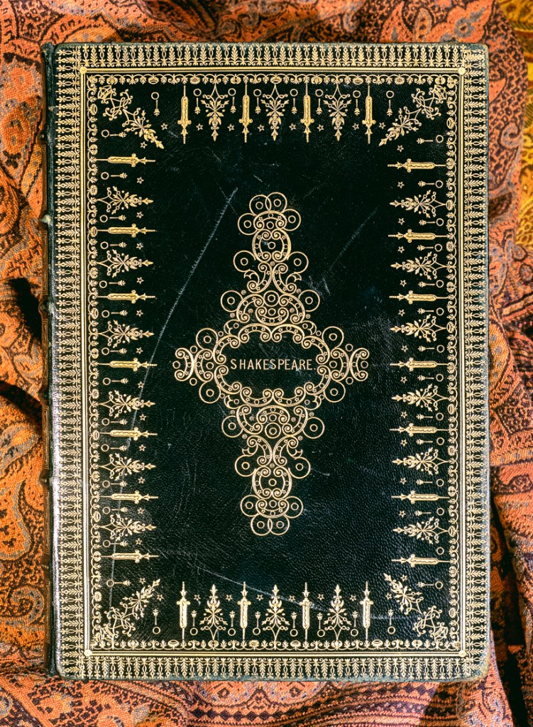 回到羅伯特・李維耶赫裝幀的【莎士比亞第二對開本】,從他留下的印記BOUND BY R. RIVIERE BATH來看,是他在巴斯時期的作品,而且是1829–32年他草創之際完成的。從風格上來看,仍有新古典主義(英國攝政時期)的流緒,儘管已有試著突破,但還是有點青澀之處。李維耶赫選擇墨綠色的摩洛哥山羊皮為書的外觀包覆材質,書封的燙金花飾安排,透過重複排列,形成規整的飾框,而書封中間則以腰子型與圓型的金屬壓花模子組合成對稱的紋章花飾,開光部分燙上莎士比亞的名字。