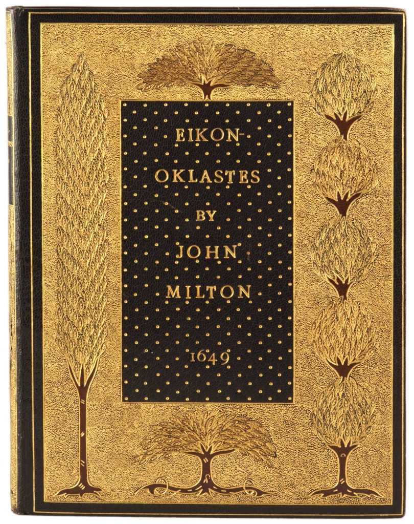 在書脊部分,以六道書肋隔成七個部分,其中的壓花依然使用書封的腰子型與圓型金屬壓花模子排列組合,細部則以幾個星型模子點綴。他在此書內外裝幀燙金壓花上,大約使用了大小不一約三十種的金屬模子。由於有的壓花是穿插與變更方向排列,因此只能單獨一次次壓花,慢慢完成全書的燙金,乍看之下,金碧輝煌,但注意細節表現後,可以發現他的用心。在三道書緣部分,也是一樣重複單獨壓花,慢慢組合的燙金技法。對此,需要穩定的操作技巧。從這也可看出,他在開始自己的裝幀事業時,便已具備十足的耐心,並能駕馭完整的裝幀技法。從他後期及他外孫經營作坊時期,這種突出技巧的裝幀方式,不斷出現在他們的作品中。