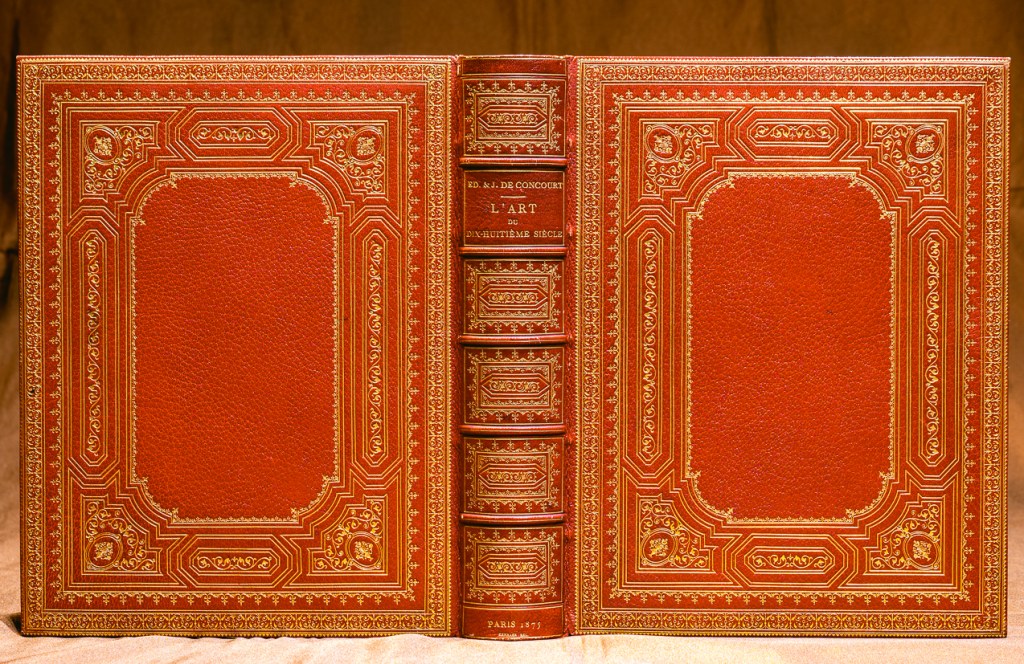 技法:銅版與活字印刷。內含1張插圖書名頁(Bracquemond刻製的龔固爾兄弟側面肖像)及66張銅版蝕刻插圖,包括42張龔固爾兄弟親自刻製的各個畫家不同作品及14張瓦宏(Adolphe Varin)刻製的藝術家肖像,包括兩張龔固爾兄弟的肖像。另外,書中也收錄了1744年,謝戴(Pierre-Quentin Chedel)所刻製的十張布雪(François Boucher)為【阿卡玉與徹爾菲】(Acajou et Zirphile)一書製作的圖稿。紅色摩洛哥山羊皮裝幀,歷史主義風格燙金押花。上書緣燙金,側書緣與下書緣毛邊。書脊下方有裝幀師EENHAES REL.字樣。