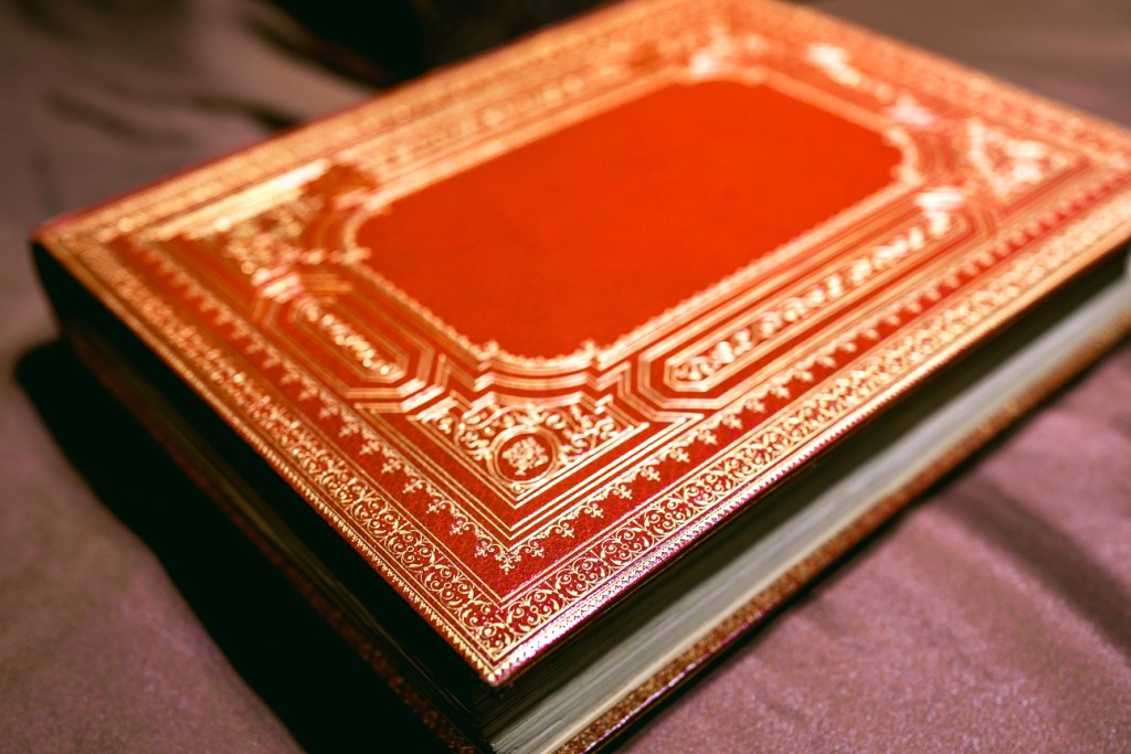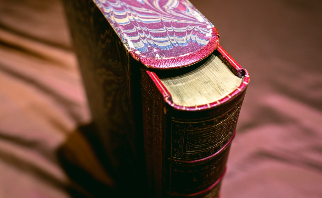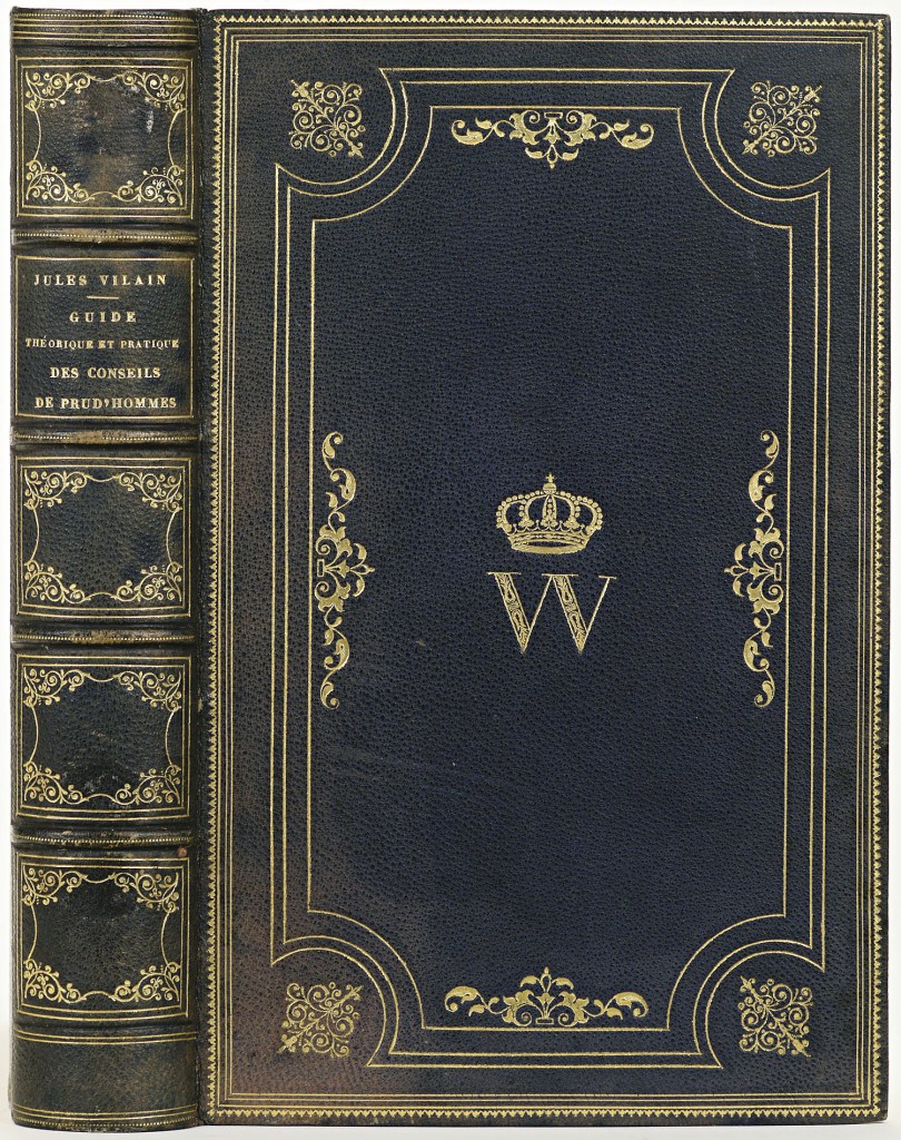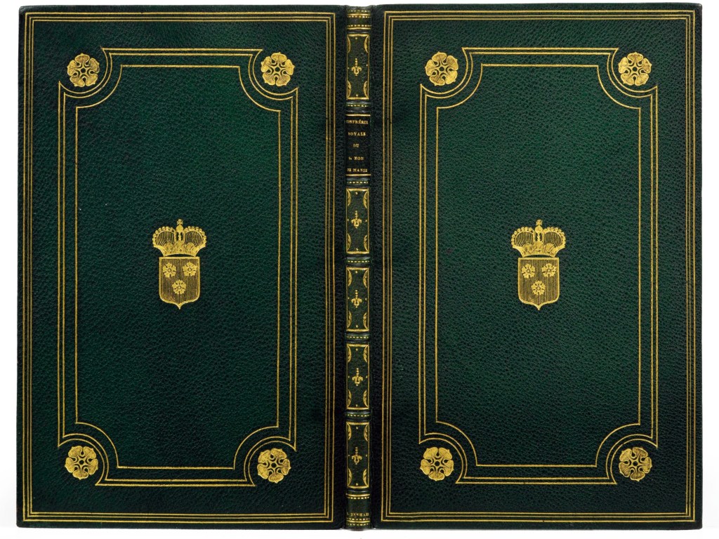 我們這本還有幾點值得注意之處。首先,此書有龔固爾兄弟的簽名(在1866年Debucourt的專刊書頁上),獻給一位名為De Morgue-Cevenent(?)的收藏家。另外,便是這本書曾為比利時二十世紀知名的藏書家西蒙森(Raoul Simonson, 1896-1965)的藏書,在蝴蝶頁處有他的摩洛哥山羊皮製的徽章型藏書票。他不僅是位出版家,也是目錄學者,以精緻華麗的圖書收藏為主,同時展現自己的比利時出身,藏品中有許多可以體現比利時特色的書籍。2013年,他的藏書成為蘇富比兩場專拍的主角。再來,本書的裝幀出自比利時十九世紀的裝幀師安海斯(Pierre-François Eenhaes, 1823-1910)之手,當時他在布魯塞爾皇帝街(rue de l’Empereur)14號執業,後遷至聖查爾斯胡同(impasse Saint-Charles)。安海斯在這本【十八世紀藝術】的裝幀上,運用當時流行的歷史主義風格,將過去文藝復興與古典的花飾,以絕妙的技巧融合在前後書封與書脊上,華麗典雅,穩重大方。蝴蝶頁的燙金花飾飾框,以三種花紋排列,細膩雅緻,配上紅色基調的大理石雲紋紙,形成令人目不暇幾的視覺饗宴。
