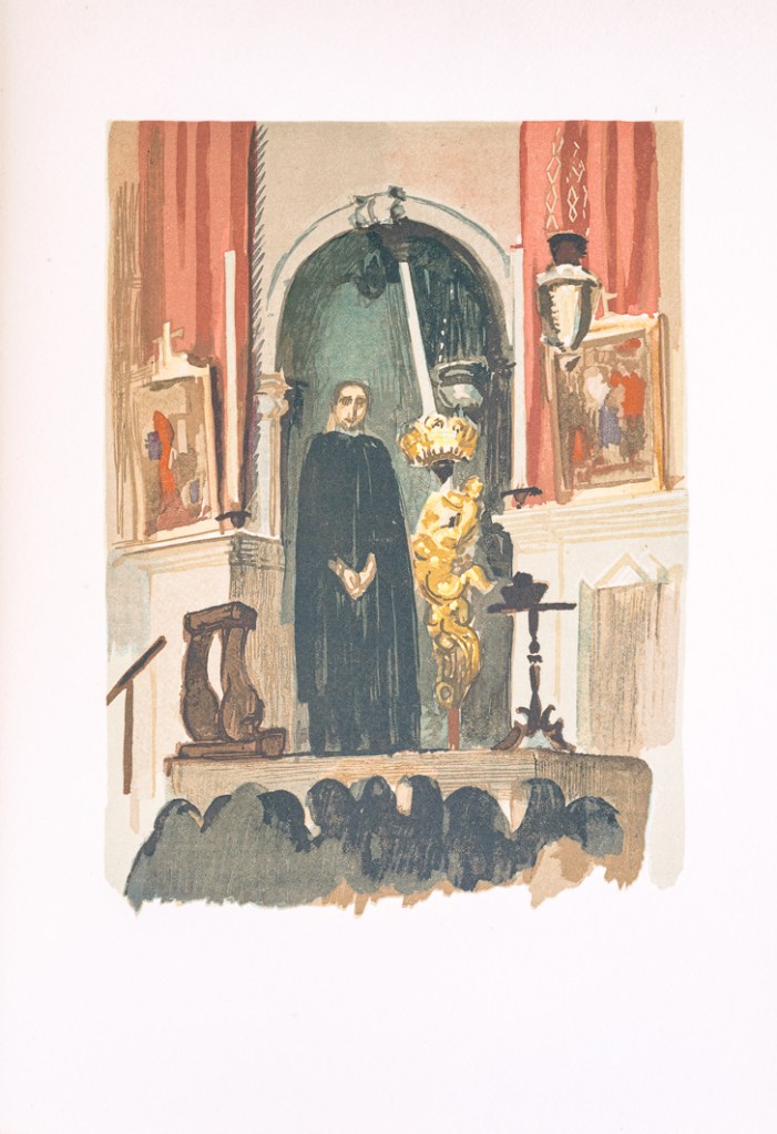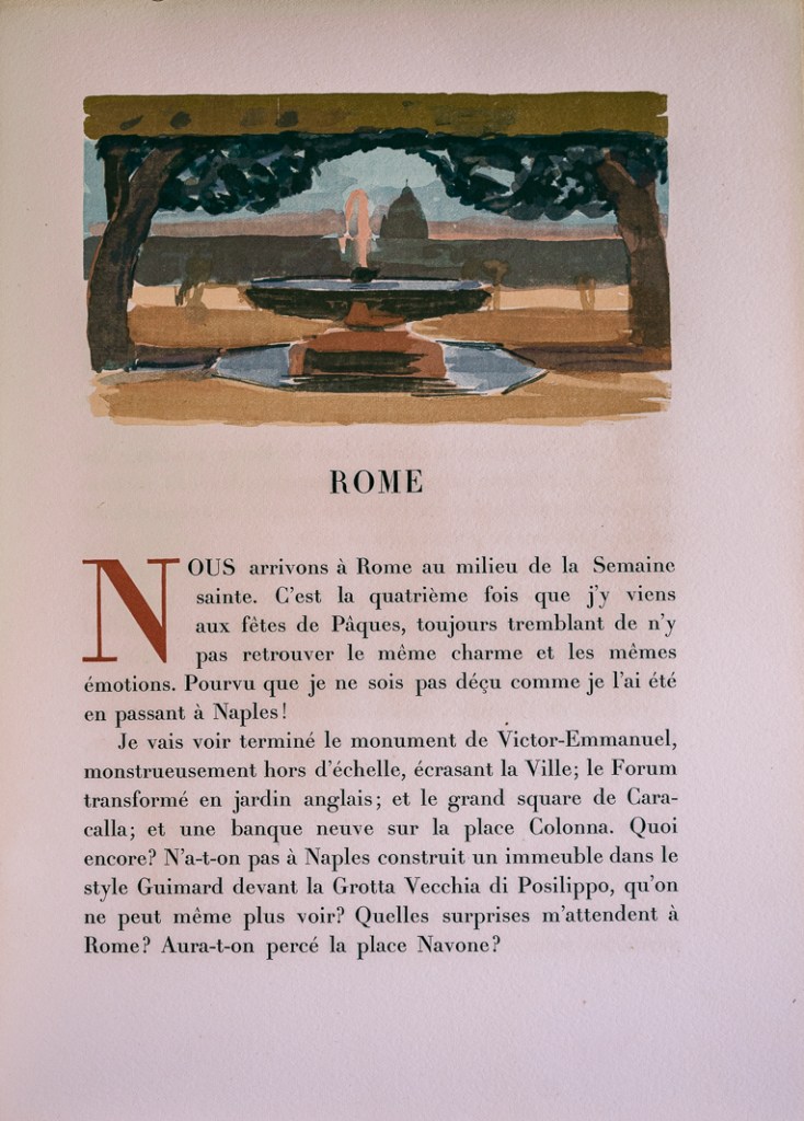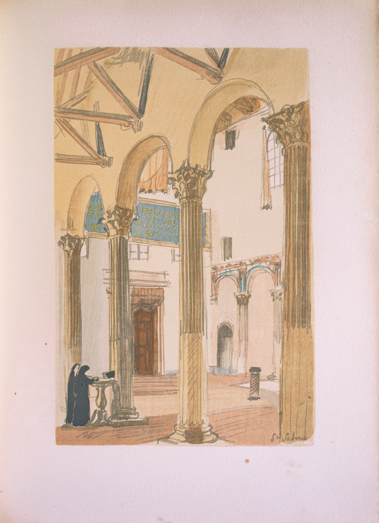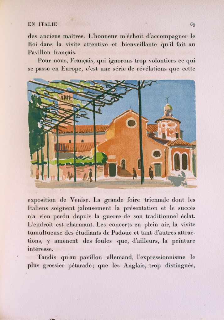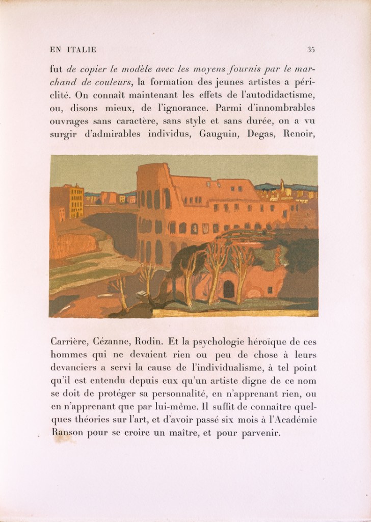 1900年起,莫里斯.丹尼對義大利文藝復興繪畫感興趣,常到義大利旅行,宗教題材逐漸多了起來。 這本【義大利旅行日記】,是他1921-1922遊歷義大利時留下的紀錄,同時也以水彩畫下義大利各地的風光。1925年,莫里斯.丹尼委託版畫家賈克・貝爾特朗(Jacques Beltrand, 1874-1977)和他的弟弟們,運用高超的彩色木刻技法,忠實還原自己的水彩作品肌里與顏色,讓自己的旅行日記問世。這位版畫家貝爾特朗出身版畫世家,自己長於木刻與硬木木刻兩種技法,由於技藝出眾,1900年起,便受到法國十九世紀大力推廣創新硬木木刻的重要藝術家奧古斯特·路易斯·勒佩爾(Auguste-Louis Lepère (1849 – 1918) 的推崇。貝爾特朗喜愛創作彩色,或同色調不同過渡的作品,主題從風景、城市景觀、肖像,到日常生活,尤以宗教題材為其主力。莫里斯.丹尼正是借用他在木刻技藝上的長才,將自己的水彩作品轉化成一幅幅精美的木刻版畫。