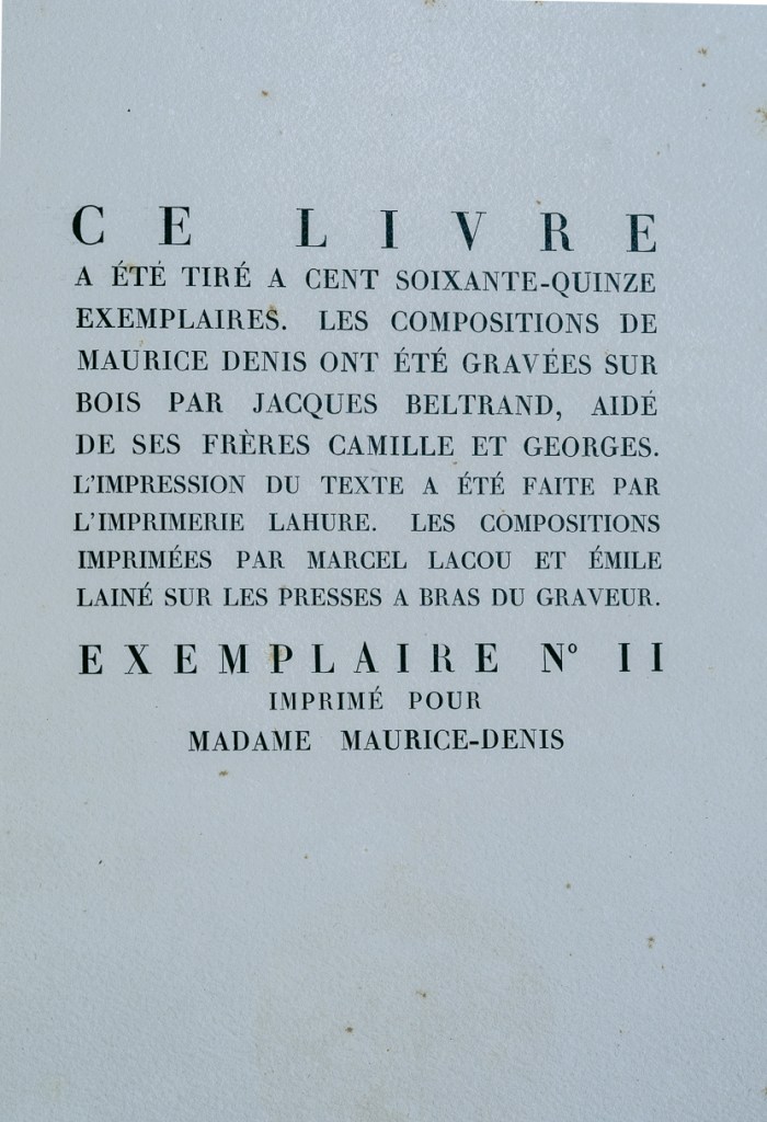 技法:活字印刷,84頁。內含34張彩色木刻插圖,包括1張書名頁插圖、4張全頁插圖及29張大小不一的內文插圖。奶油色燙金書名紙書衣與散頁書頁,收納在木刻壓花紙板書夾,配上固定絲帶。書頁有泛黃及斑點。本書限量175本,這本編號2(II),保留給作者Maurice Denis的妻子。