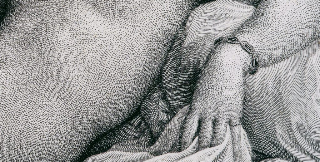 為了追求更佳的複製效果,史特朗在版面處理上,頗費思量。除了以高超的蝕刻技法慢慢摩塑原來畫面中的各種造型與人體,亦小心掌握畫面的色階變化,畢竟在拿掉顏色後的黑白版畫,從暗部到亮部的各種階調,就成了決定畫面好壞的一個關鍵。欣賞這件【達那厄與金雨】的版畫作品,可以想像史特朗在製版時的各種細膩手法,從最輕盈細微、宛若游絲的線條到粗重的黑階立體線條,都需要極高的耐心與技巧,才能完成。