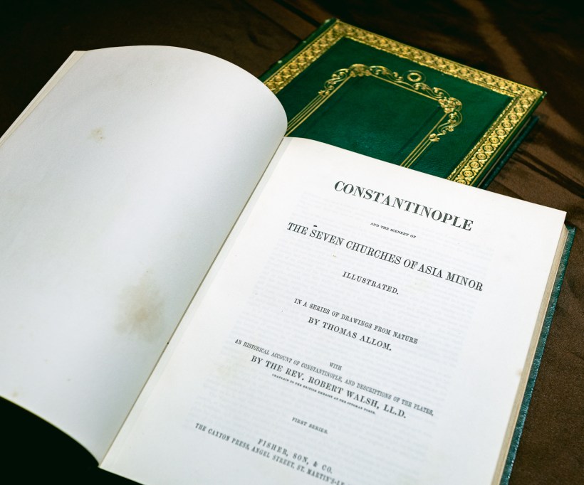 鋼版在1820年代起,開始運用在書中的插圖製作上,這種原本用來印製鈔票的技法,不僅提高了圖版的印量,也賦予畫面更多精細的刻製空間,十分適合插圖書籍,因此,旅遊圖冊或展現各地風光景致的書籍,有了進一步的發展。英國費雪出版社(Fisher, Son & Co.)在1830年代後,出版了許多這類書籍,【君士坦丁堡與小亞細亞七間教會】 便是其中一件出版品。書中圖像的製作者湯瑪士・艾隆(Thomas Allom)雖然是位建築師,在倫敦設計過許多建築,最知名的便是位於諾丁丘(Notting Hill)的聖彼得教堂,但他最為人稱道的,則是遊記書籍的風景插圖繪製了。約1845年出版的【中國圖冊】(China Illustrated)更是當時歐人想像的華人世界,只是,艾隆筆下的中國風情,並非他親自走訪而得,而是透過之前的中國圖像,再加上當時英國的中國訊息,加以轉化而成。