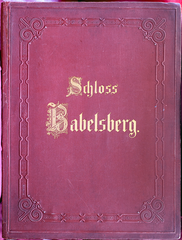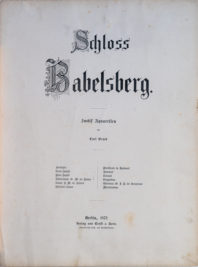 名稱:【巴伯斯貝格堡:十二幅水彩】(Schloss Babelsberg. Zwölf Aquarelle)。 12張石版分別為:1. 書名頁插圖;2. 城堡正面;3. 城堡後面;4. 威廉皇帝的工作室;5. 皇后房間;6. 圖書室;7. 餐廳的華麗壁爐;8. 餐廳;9. 舞會大廳;10. 樓梯間;11. 儲君住所;12. 機械間。