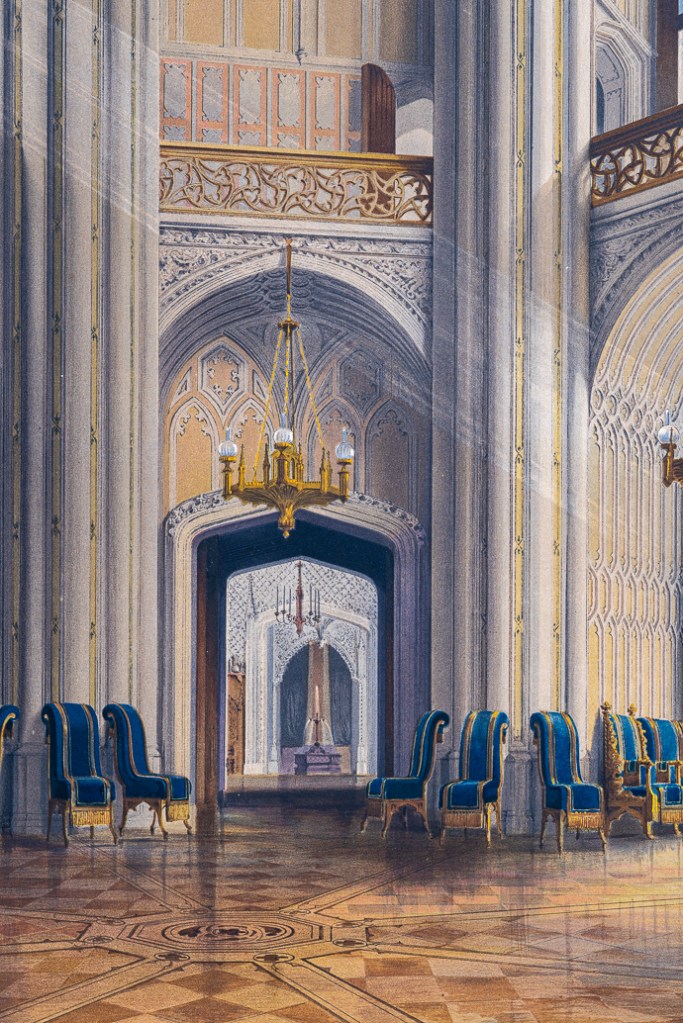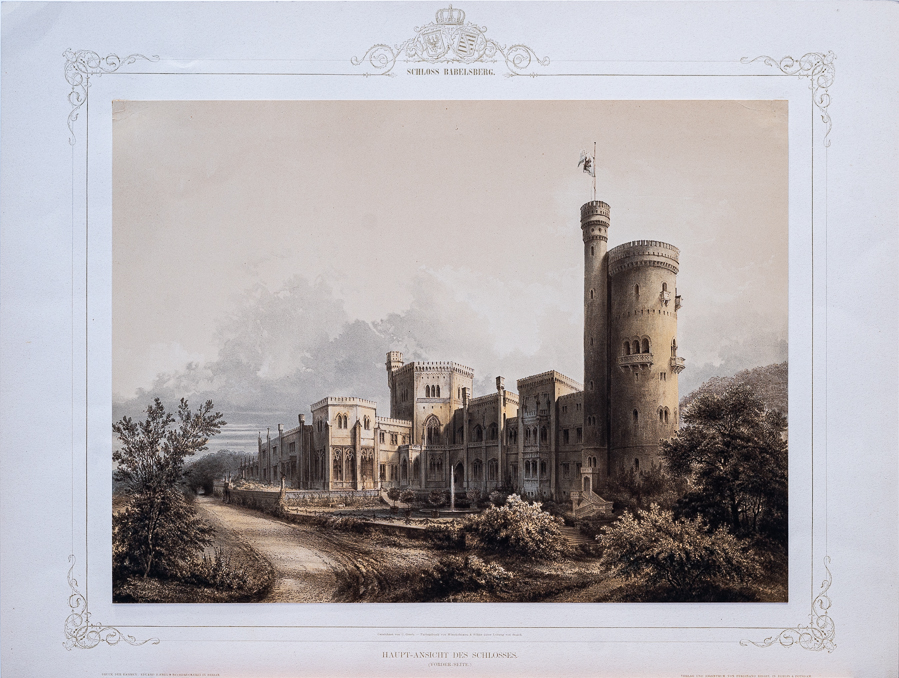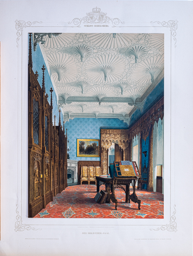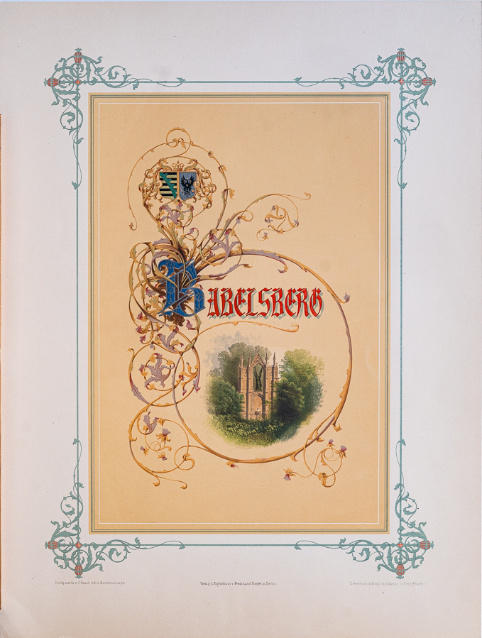 這套彩色石版畫册,紀錄了巴伯斯貝格堡(Schloss Babelsberg)的內外景緻。這座城堡建於1833-1849年,分兩個階段完成,是當時普魯士威廉王子(Wilhelm Friedrich Ludwig, 1797-1888)的夏宮所在。1829年,威廉和奧古斯塔·卡特琳(Augusta Marie Luise Katharina, 1811-1890)成婚,當時的普魯士國王腓特烈·威廉三世(Friedrich Wilhelm III, 1770-1840)出資為二兒子在波茨坦(Potsdam)的巴伯斯貝格城區建造居所,由知名的新古典主義建築師卡爾·弗里德里希·申克爾(Karl Friedrich Schinkel, 1781-1841)負責設計,由於當時歐洲流行哥德式的復古風潮,設計遂以哥德風為主軸。在德國浪漫主義的這個時期,城堡象徵著德意志的整體,加上威廉的妻子奧古斯塔迷戀英國的哥德風格,並自行專研,在設計上和建築師申克爾多所衝突。然而,最後由於經費不足,城堡整體設計只完成了一部分。1835年10月,第一階段落成,新哥德式的落地大窗引進大量光線,可以飽覽周圍的風景,另外,也包含了做為餐廳的八角建築。
