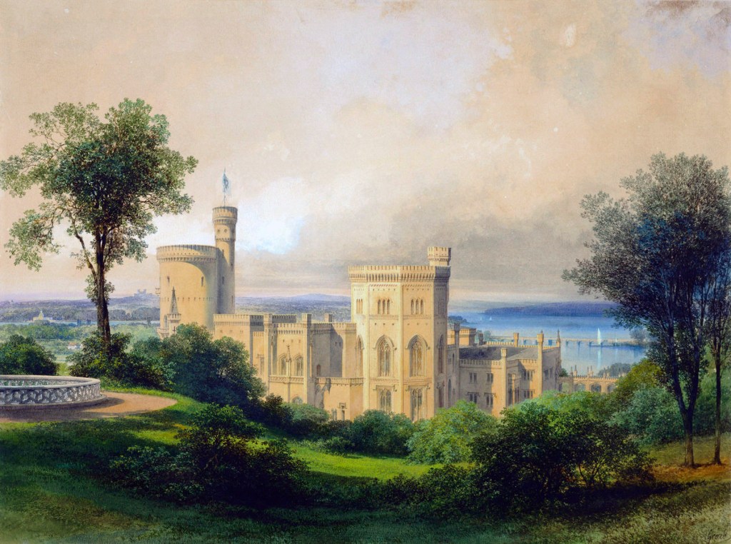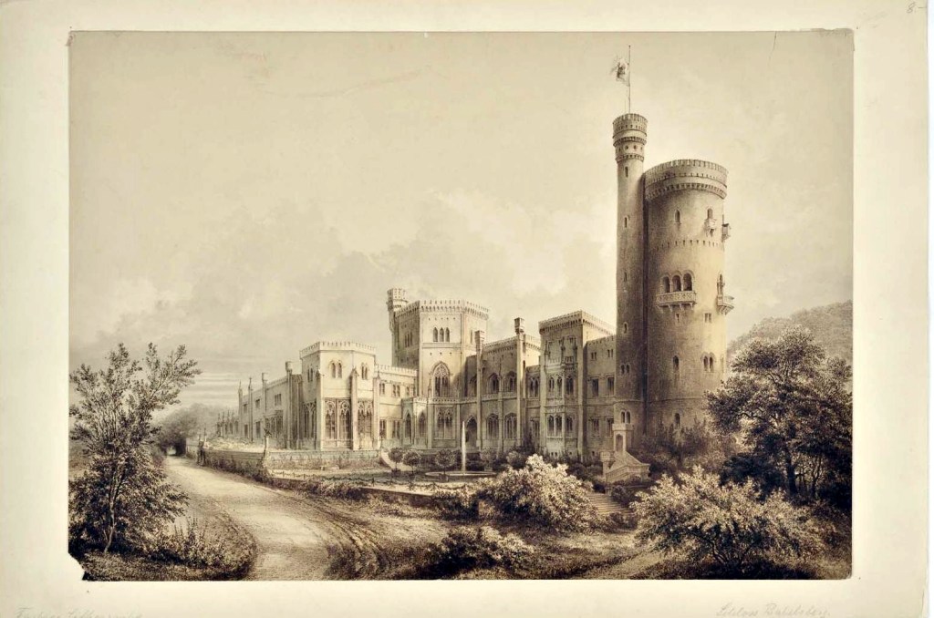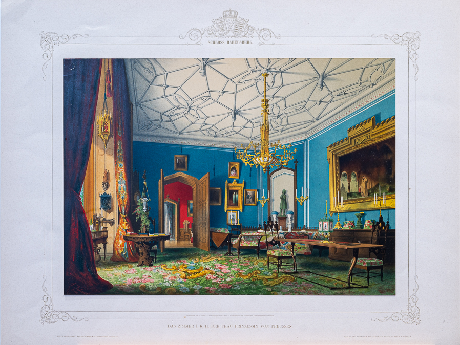 這套由柏林恩斯特與孔恩出版社(Verlag Ernst und Korn)發行的畫冊,從預購者名單中,可以知道一共印製了126套,多是王公貴族與商賈顯貴,而且發行年代1872年,正是這座城堡的主人普魯士國王威廉一世成為德意志帝國的第一任皇帝的隔年,宣揚與展示皇帝行宮的企圖不言可喻。製作畫冊圖稿的藝術家為卡爾・葛雷伯(Carl Georg Anton Graeb, 1816 – 1884),他是十九世紀上半葉德國浪漫主義風景大師,當時普魯士美院教授卡爾・布萊森(Carl Eduard Ferdinand Blechen, 1798 – 1840) 的學生,也向當時的宮廷畫師,他未來的丈人約翰・蓋斯特(Johann Gerst, 1792-1854)學畫。1838年,他成為柏林國王市立劇院的劇場畫家,但十四個月後,便周遊歐洲各地長達四年,並不時展出自己旅行途中的作品。1844年,他回到柏林,和丈人開設劇場裝飾畫作坊,直到1851年被任命為宮廷畫家為止。