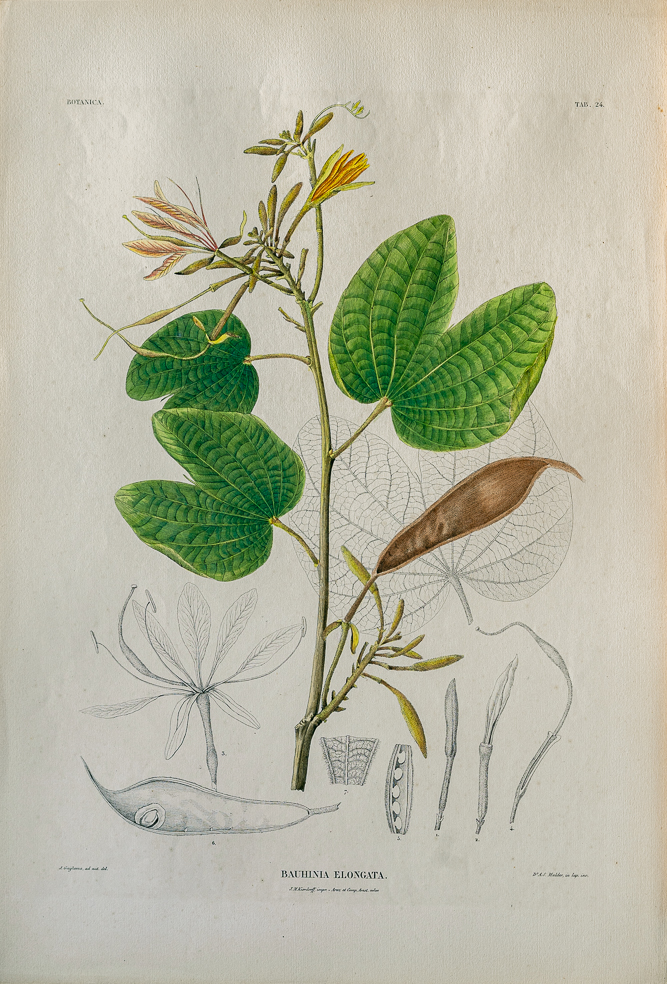 名稱:豆科植物(Bauhinia Elongata),圖24,出自:【荷蘭海外屬地自然歷史紀要】(Verhandelingen over de natuurlijke geschiedenis der Nederlandsche overzeesche bezittingen by C.J. Temminck, published in Leiden by S. en J. Luchtmans en C.C. van der Hoek)。