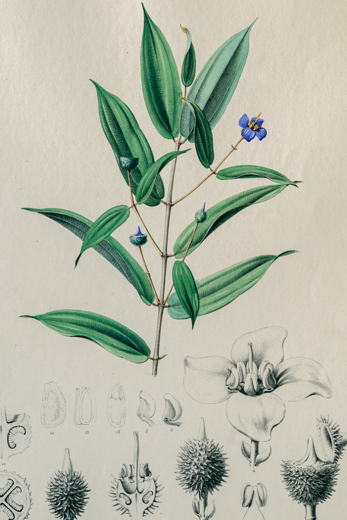 名稱:野牡丹科植物(Kibessia Cordata),圖66,出自:【荷蘭海外屬地自然歷史紀要】(Verhandelingen over de natuurlijke geschiedenis der Nederlandsche overzeesche bezittingen by C.J. Temminck, published in Leiden by S. en J. Luchtmans en C.C. van der Hoek)。