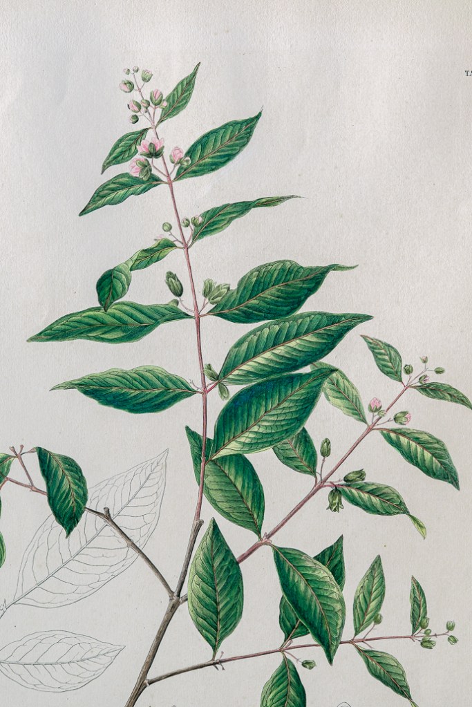 名稱:黃牛木 (Cratoxylon Polyanthum),圖36,出自:【荷蘭海外屬地自然歷史紀要】(Verhandelingen over de natuurlijke geschiedenis der Nederlandsche overzeesche bezittingen by C.J. Temminck, published in Leiden by S. en J. Luchtmans en C.C. van der Hoek)。