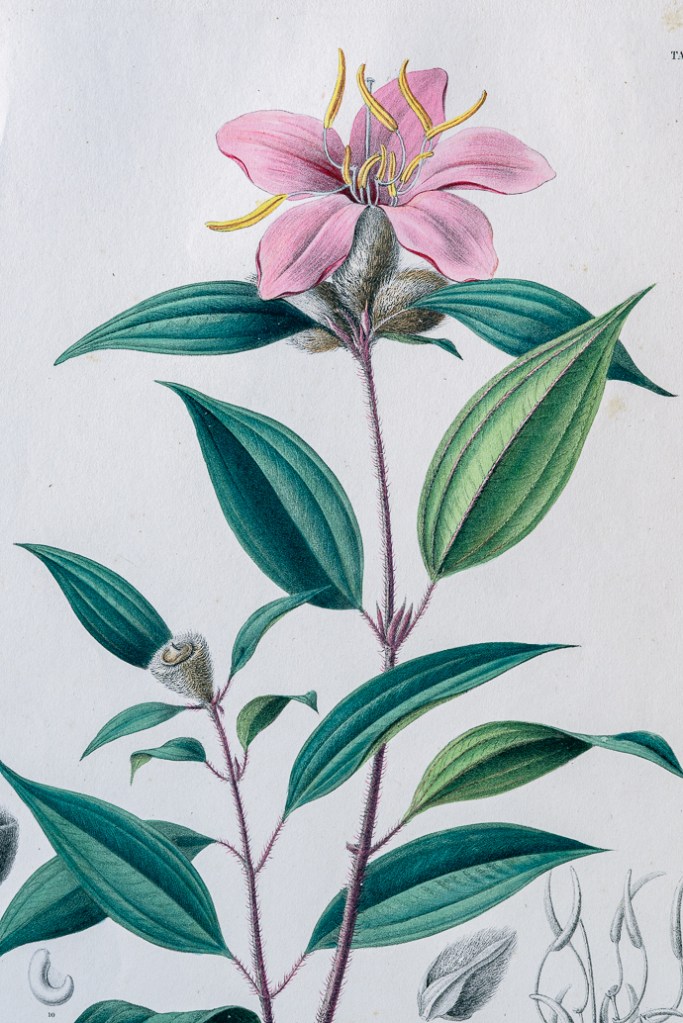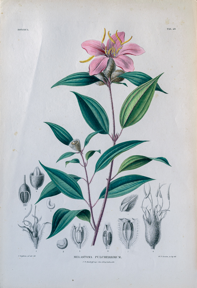 名稱:野牡丹屬(Melastoma Pulcherrimum),圖49,出自:【荷蘭海外屬地自然歷史紀要】(Verhandelingen over de natuurlijke geschiedenis der Nederlandsche overzeesche bezittingen by C.J. Temminck, published in Leiden by S. en J. Luchtmans en C.C. van der Hoek)。