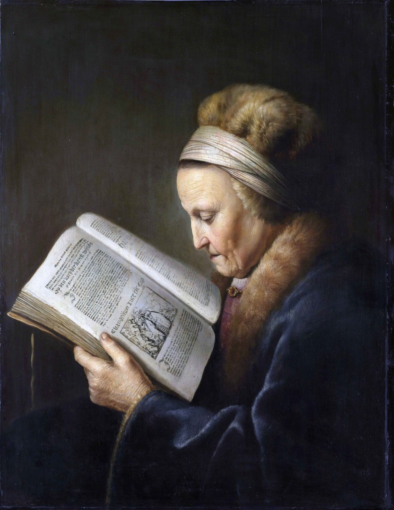 十七世紀初的荷蘭,正處於轉變之中,也正在迎來他們的黃金時代。1568年開始的獨立戰爭,還要八十年才告一段落。這場戰爭改變了荷蘭的社會結構,宗教難民湧入,儘管仍有衝突,但寬容的意識逐漸佔據上風。至於社會地位的衡量,不再取決出身,而是收入,階級流動較歐洲其他地區來得活潑。這幅1630年代完成的作品,某種程度反映出當時的社會意識形態。老婦人的衣著雖然昂貴,卻不奢華,反顯低調,這正符合喀爾文教派的樸實教誨,從她認同聖經中的撒該來看,她應該不是出身傳統的貴族世家,而是新興的商人階層。荷蘭此期貿易積累出來的財富,投入許多領域,藝術、文學、科學與慈善事業,都有長足的發展。從這角度來看,【閱讀中的老婦】不單只是單純的閱讀,反而展現當時荷蘭人對財富再分配的一種思考。