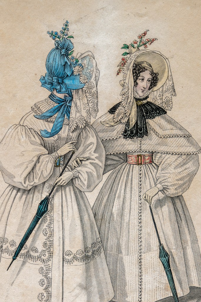 這張時尚版畫,反映出一個新時代風格的出現,那是所謂的復辟風格。隨著拿破崙失勢,「帝國式腰線」也失去了地位。新一波的流行身形是像沙漏般的形狀,中間細窄,上下兩頭變寬。裙子與上半身衣物肩線的寬度都大幅增加,原本強調自然輕巧的線條、衣服材質,被層層包裹的絲綢取代,可說是嚴肅而保守的衣著時代開端。