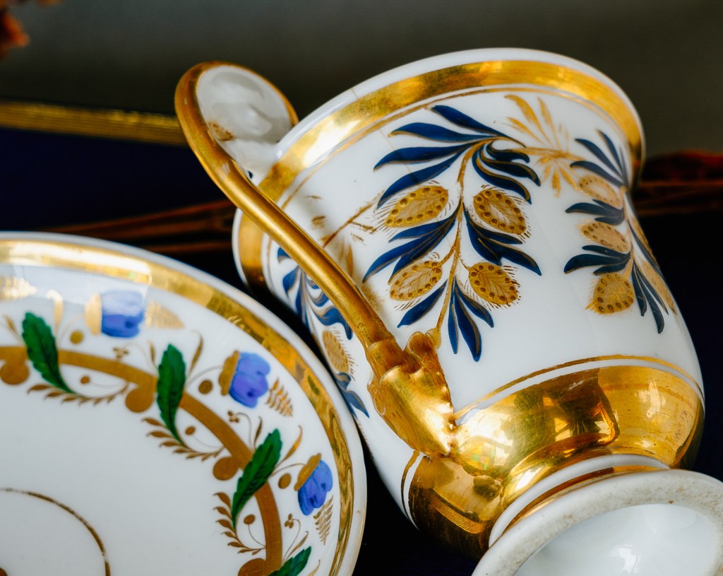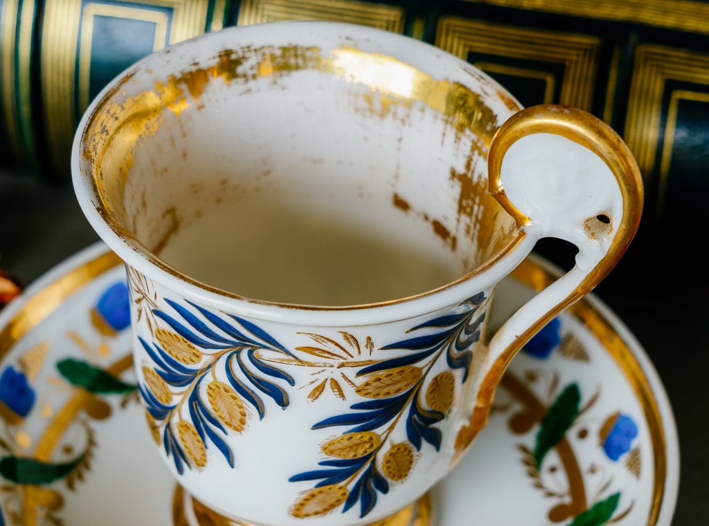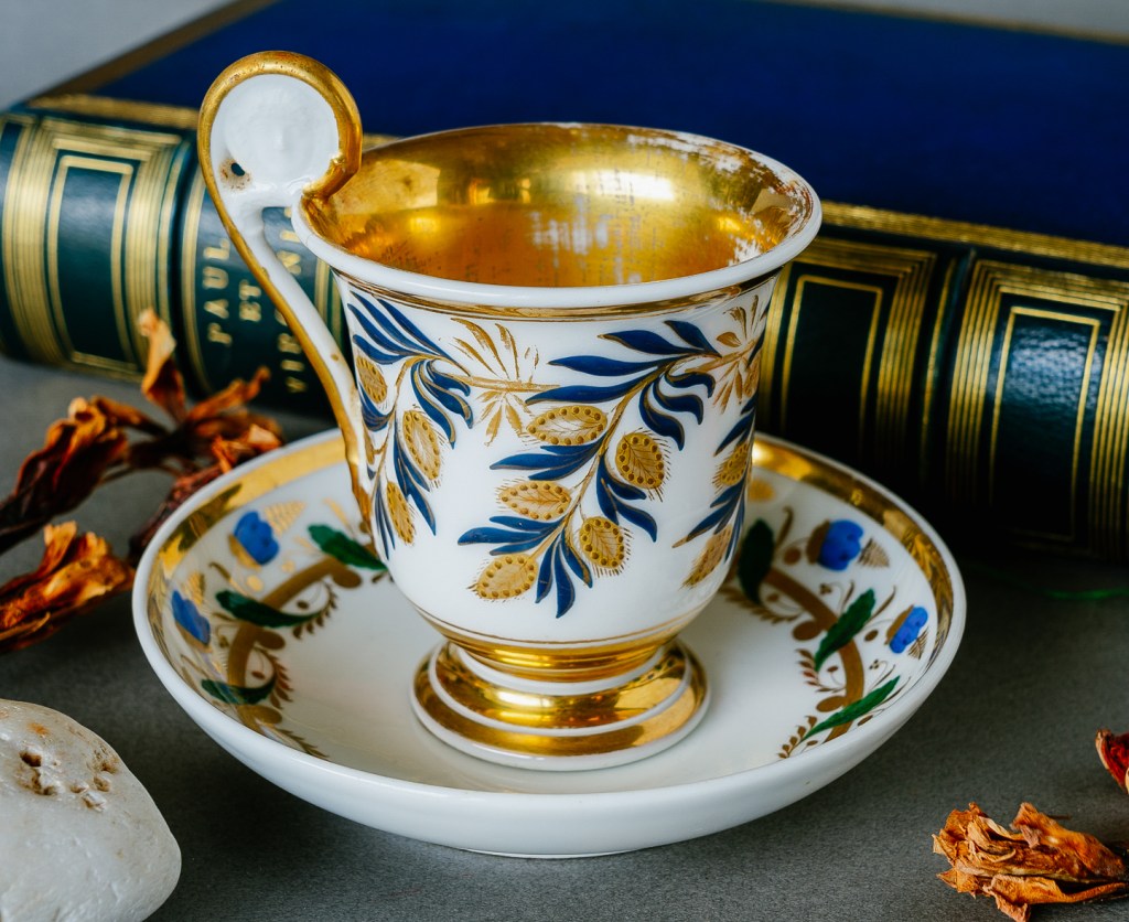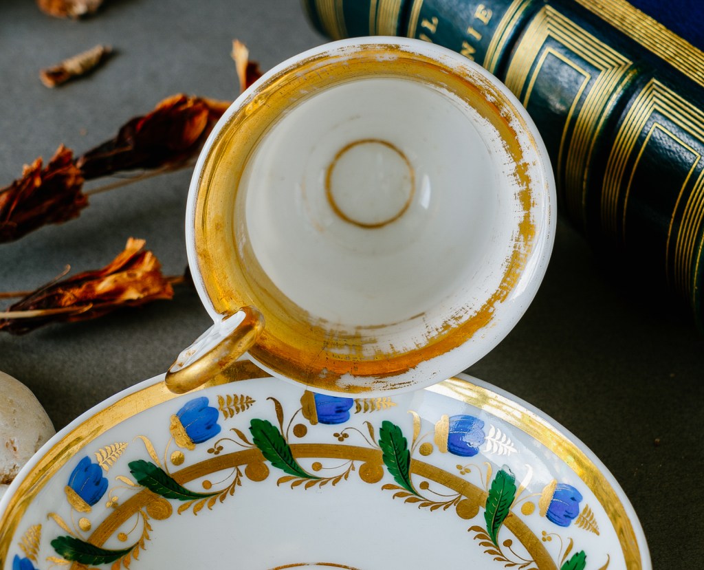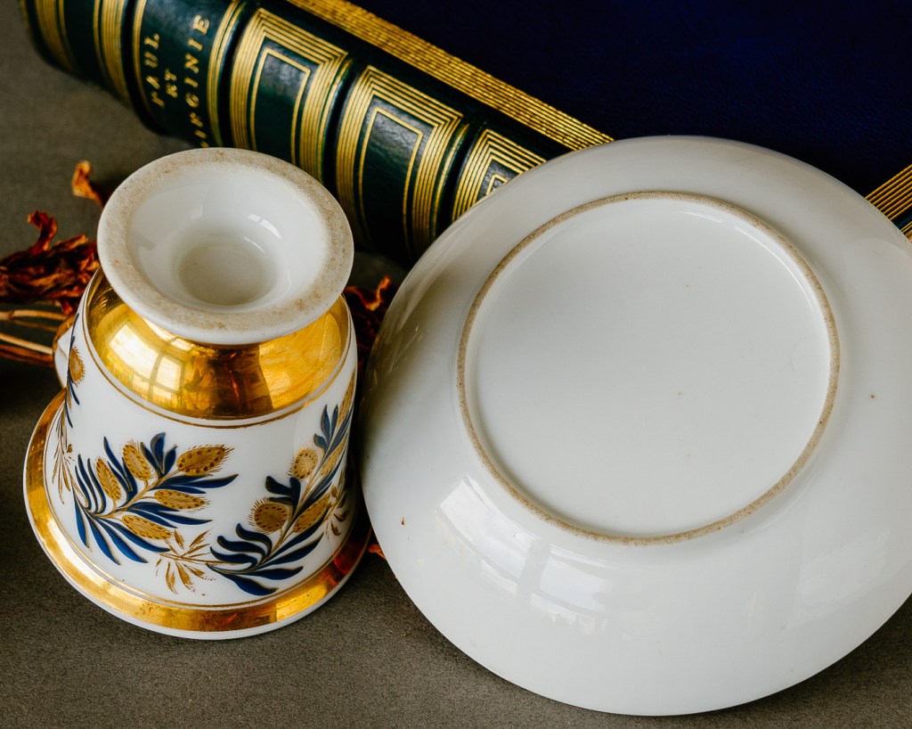 這客可可杯從胎體來看,是屬於德奧地區的硬瓷,但裝飾風格則流露明顯的民窯手法,透過某種禾本科植物(兔尾草?),以藍彩與描金手法裝飾整圈杯體,而托盤的花飾更為多元,百花齊放,藍綠彩與花飾描金,增加了視覺饗宴。杯內側描金脱落嚴重,杯體亦有一道細裂縫(不會滲漏),整體設計仍展現民窯豐富的創意。