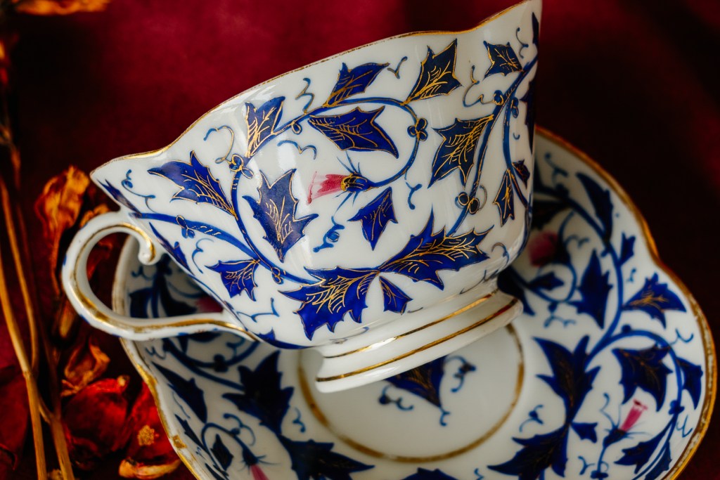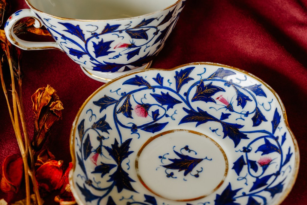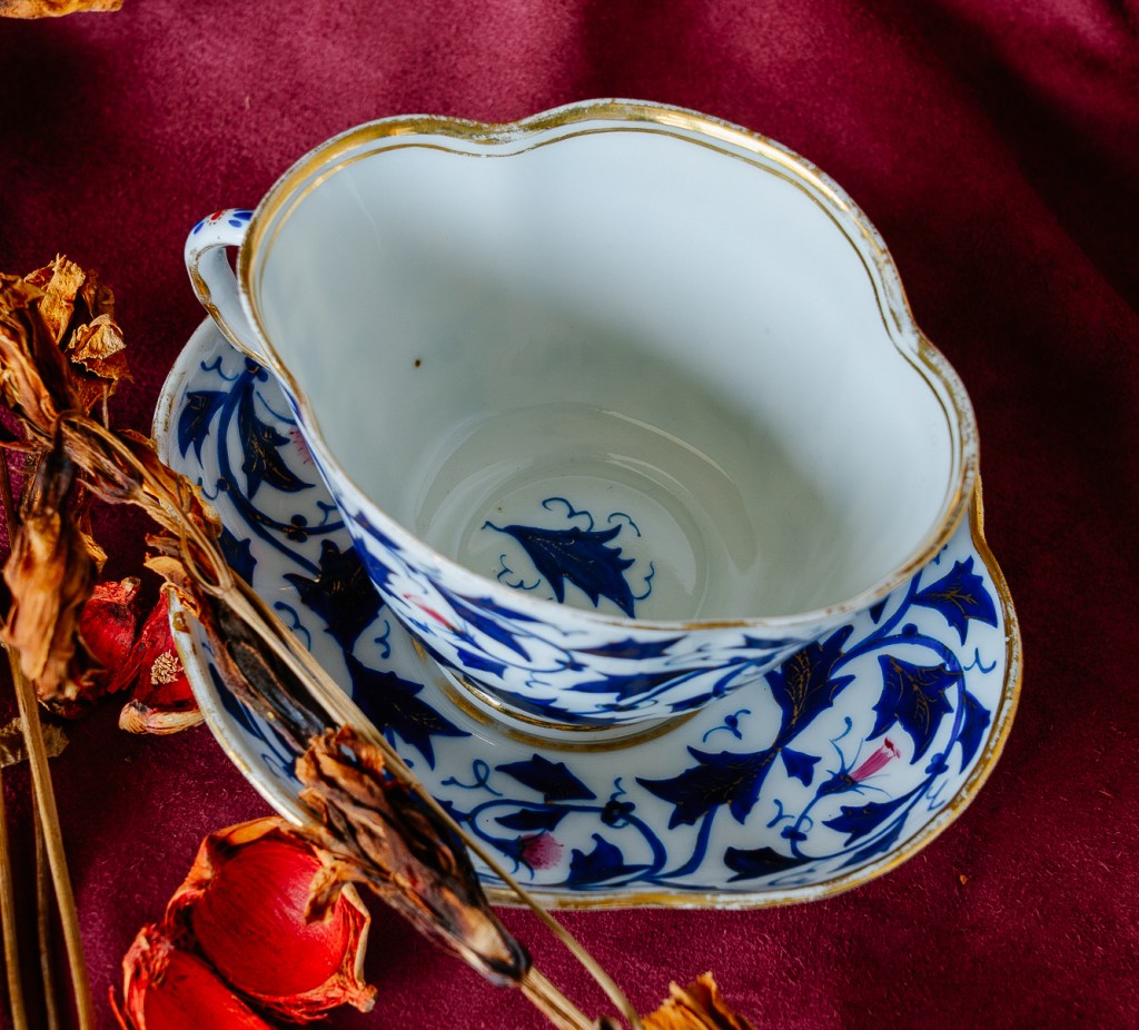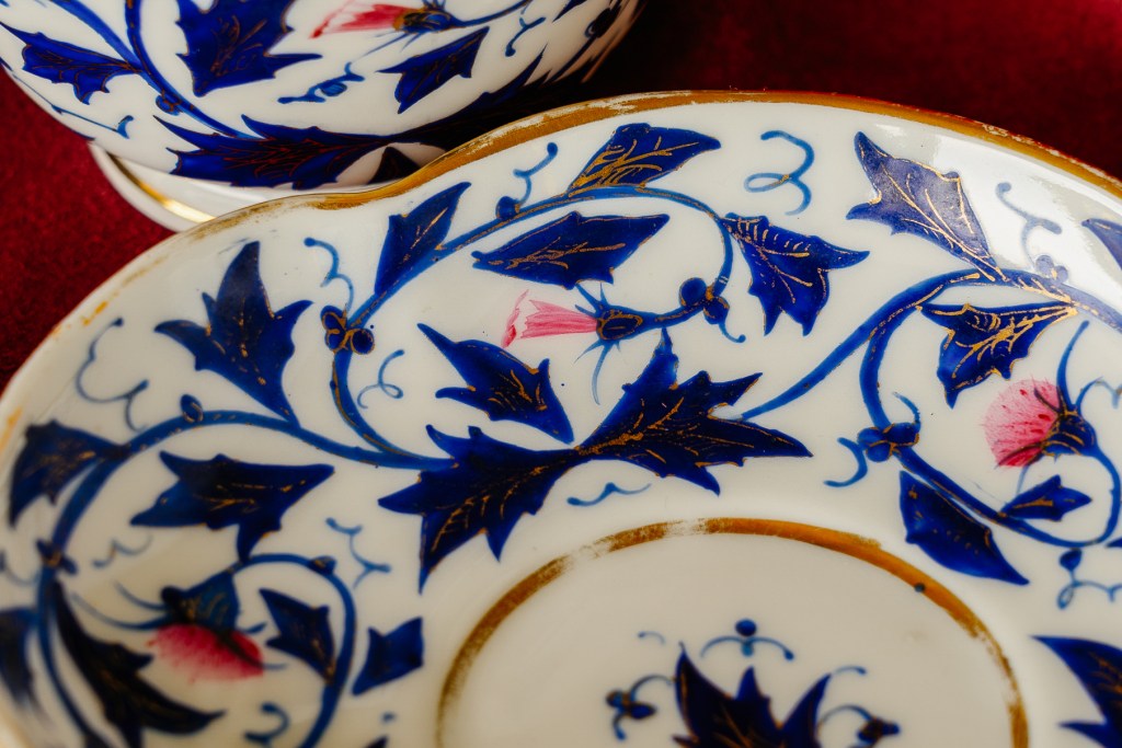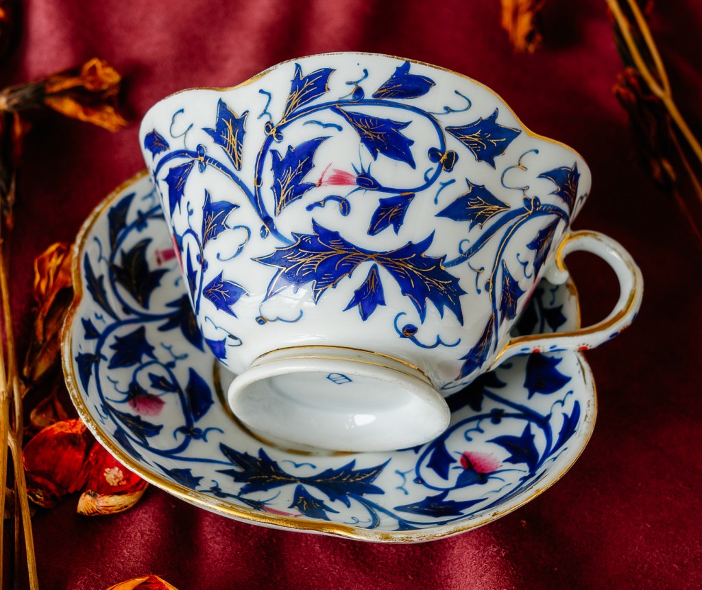 這客可可瓷杯造型別緻,透過高超的拉胚工藝,完成精巧的四葉半形體,胎體略博。之後再施以鈷藍色釉上彩繪,完成藤蔓葉片花飾,點上描金與花朵,是款少見的瓷杯。描金略有脫落磨損,整體杯況仍佳。