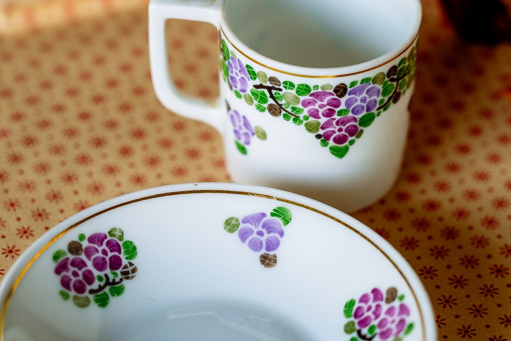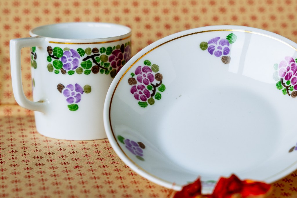 在二十世紀初,窯廠更以新藝術風格推出許多令人愛不釋手的瓷器。這客濃縮咖啡杯便是這個時代的產物,畫師在雪白的胎身上,透過幾何圖案安排,表現出葡萄成熟豐收的樣子,翠綠的葉子圍繞著紫紅色的葡萄,中間穿插深褐色的枝幹,成了醒目動人的色彩饗宴。