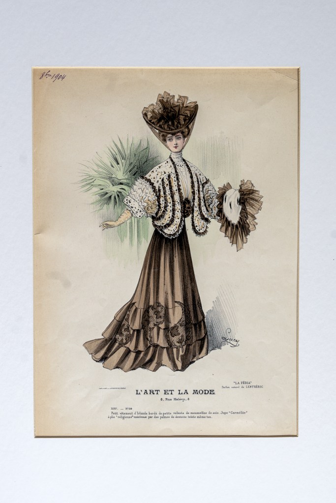 我們收藏的【藝術與時尚】插圖,皆為二十世紀初,新藝術時期的產物。可以看出保有1890年後的女裝新趨勢,不再使用各種裙子支撐物,裙子自然地垂下,羊腿袖或澎澎袖(袖子造型猶如羊腿一般,上端蓬開,近手腕處的一段則收緊)成為視覺焦點。大型的袖子搭上平整A字長裙,整體視覺效果讓腰部看起來更為纖細。同時在新型束腰馬甲輔助下,又出現一種新的女裝輪廓:「S形曲線」,同樣是要塑造出細到不能再細的纖腰。